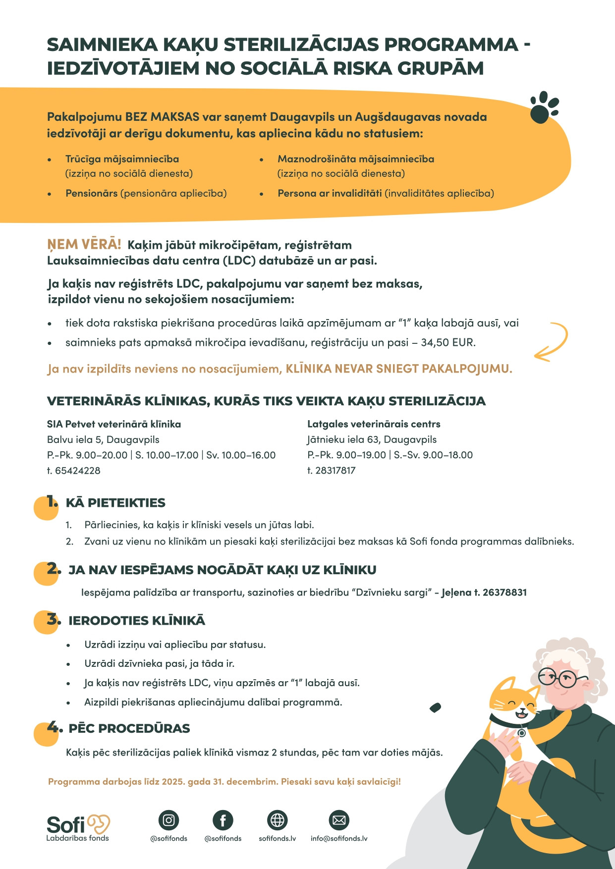 Klīnikā uzrādot derīgu apliecību vai izziņu no sociālā dienesta, pakalpojumu varēs saņemt iedzīvotāji, kuriem oficiāli piešķirts trūcīgas vai maznodrošinātas mājsaimniecības statuss, pensionāri un cilvēki ar invaliditāti. Sterilizācijas un kastrācijas izmaksas gan runčiem, gan kaķenēm pilnībā segs Labdarības fonds Sofi jaunizveidotās Saimnieka kaķu sterilizācijas programmas ietvaros.