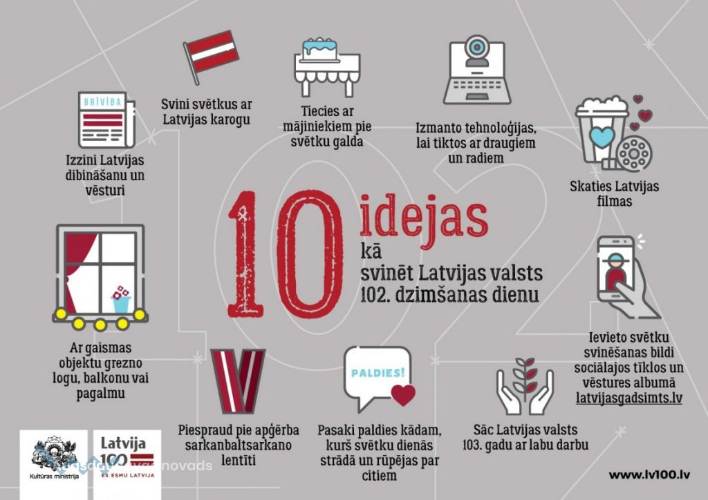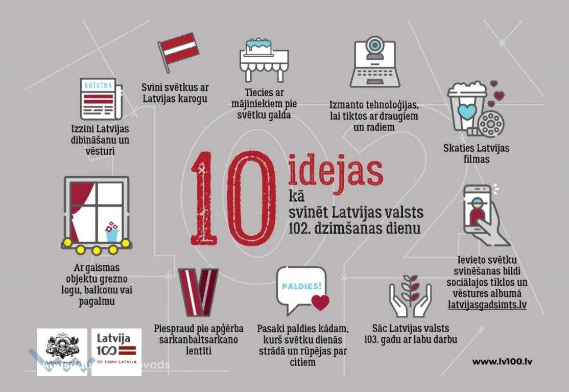 Šogad aprit 102. gadadiena kopš Latvijas Republikas neatkarības proklamēšanas 1918. gada 18. novembrī Rīgas pilsētas Otrajā teātrī, kuru šodien pazīstam kā Latvijas Nacionālo teātri. Piedāvājam desmit idejas, kā šogad svinēt Latvijas valsts dzimšanas dienu. Lai šīs idejas kalpo kā ierosme valsts svētku svinēšanai! Priecāsimies, ja šim sarakstam pievienosiet arī savas idejas, kā valsts svētku laiku padarīt īpašu.