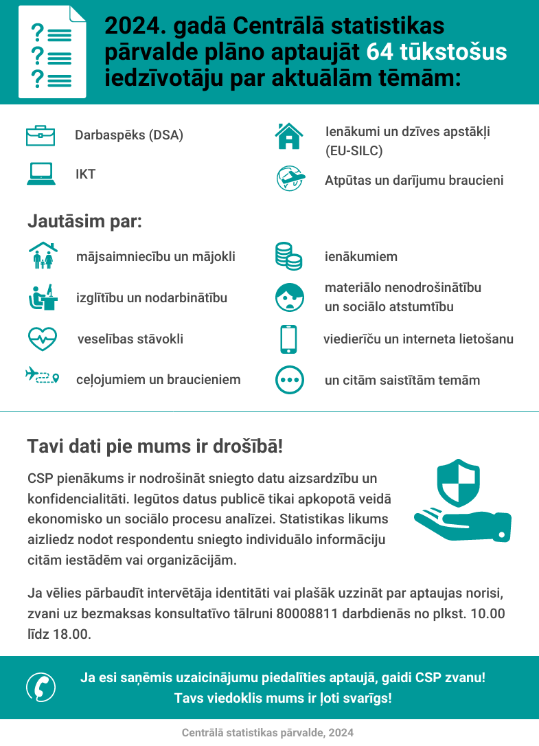 2024. gadā Centrālā statistikas pārvalde (CSP) veiks četras ikgadējās iedzīvotāju aptaujas: par darbaspēku, ienākumiem un dzīves apstākļiem, IKT lietošanu, kā arī atpūtas un darījumu braucieniem, kurās plānots iesaistīt aptuveni 64 tūkstošus Latvijas iedzīvotāju.