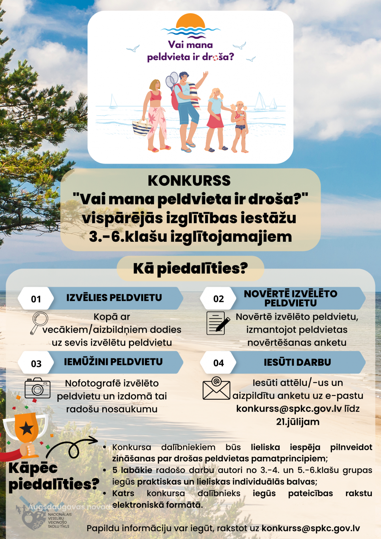 Vasara rit pilnā sparā, tāpēc nenokavējiet iespēju piedalīties Slmību profilakses un kontroles centra (SPKC) konkursā vispārējās izglītības iestāžu 3.-6. klašu skolēniem “Vai mana peldvieta ir droša?”, kura mērķis ir veicināt skolēnu izpratni par drošas peldvietas pamatprincipiem un rosināt skolēnus un viņu vecākus/aizbildņus izvērtēt drošības apstākļus skolēna izvēlētā peldvietā. Informējam, ka konkursa darbu iesniegšana tiek pagarinātalīdz 21. jūlijam.