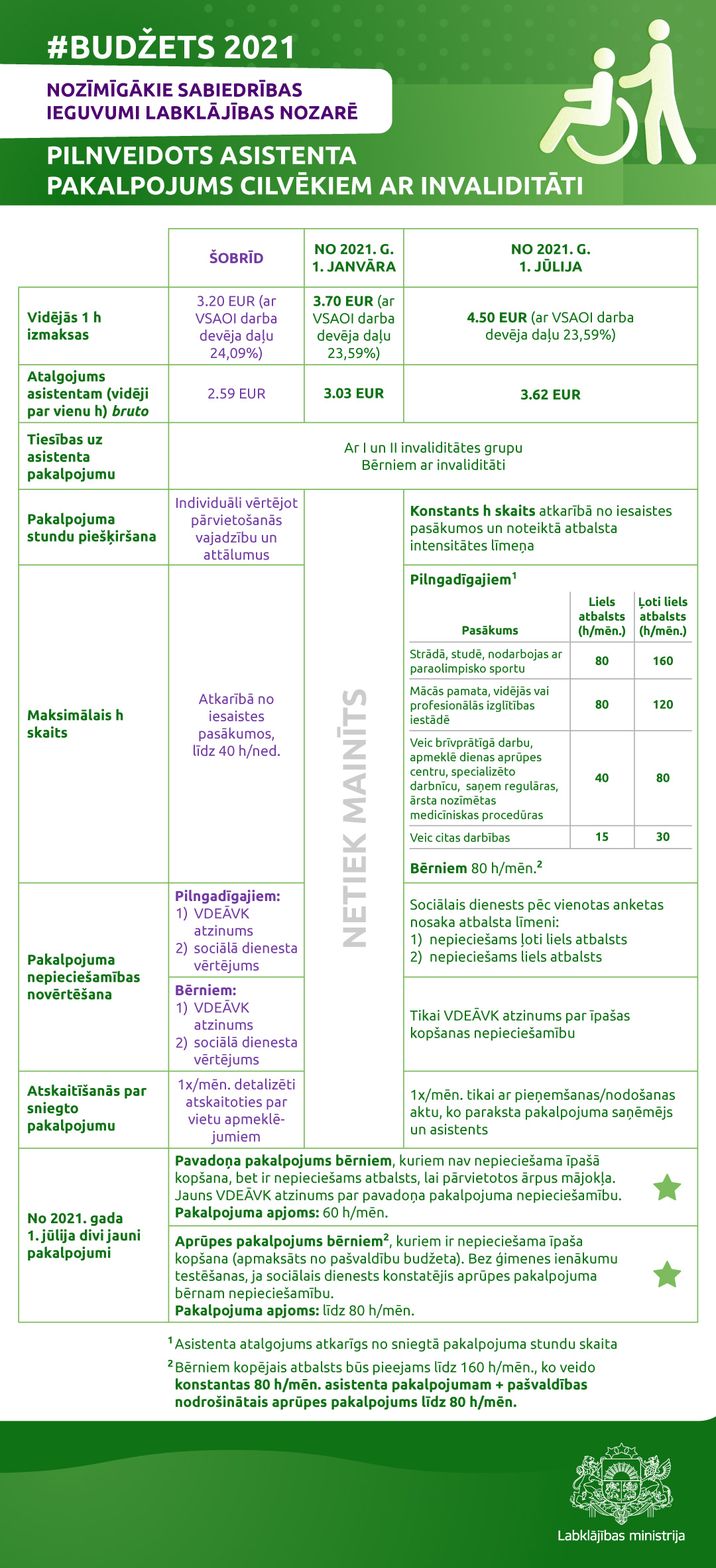 Panākta vienošanās par izmaiņām asistenta pakalpojumā no 2021. gada 1. jūlija. Tiks mazināts birokrātiskais slogs – kļūs vieglāka atskaišu sagatavošana, tiks piešķirts noteikts asistenta pakalpojuma stundu skaits mēnesī, ko cilvēks, kam nepieciešams šāds pakalpojums, būs tiesīgs izmantot pēc saviem ieskatiem. Tiks ieviesta vienota nepieciešamības pēc asistenta atbalsta novērtēšanas anketa pieaugušajiem un arī palielināts atalgojums asistentiem.
