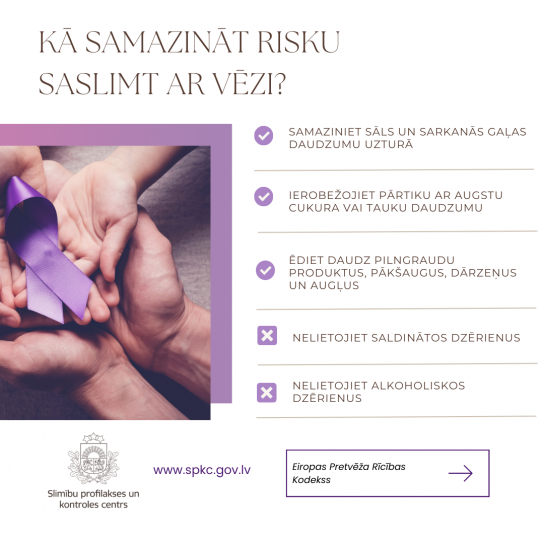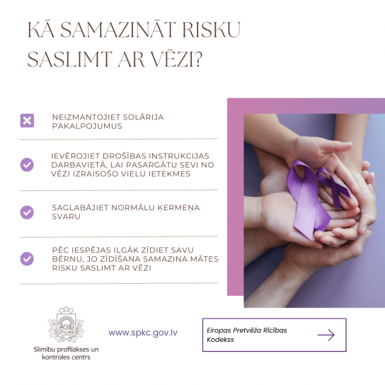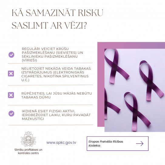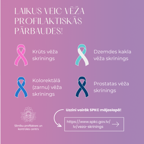 Pasaules pretvēža dienas ietvaros aicinām izrādīt rūpes par savu veselību, gan izmantojot iespēju veikt valsts apmaksātas vēžu profilaktiskās pārbaudes, gan veicot aktivitātes, lai samazinātu risku saslimt ar vēzi.