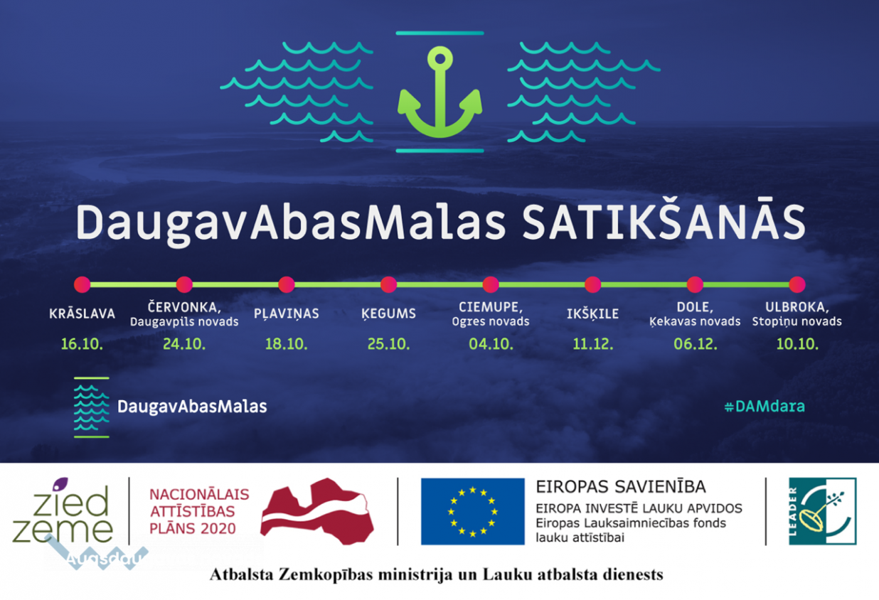 Kopumā oktobrī un decembrī notiks 8 “DaugavAbasMalas” satikšanās, un katrai no konferencēm ir sava tēma, kas dos iespēju iedziļināties plašā jautājumu klāstā un risināt specifiskām mērķa grupām aktuālas problēmas. Pirmā konference norisināsies 4. oktobrī Ogres novadā, kur tiks iezīmēti kopīgi veicamie darbi. Otrā konference notiks 10. oktobrī Stopiņu novadā, un tajā tiks diskutēts par NVO lomu un iespējām Daugavas baseinā. Trešā daugaviešu satikšanās būs veltīta tūrisma nozarei, un tā norisināsies 16. oktobrī Krāslavas novadā. 18. oktobrī Pļaviņu novadā, “DaugavAbasMalas” ceturtajā konferencē, aicināti pulcēsies Daugavas baseina pašvaldību vadītāji, savukārt uz piekto konferenci 24. oktobrī Daugavpils novadā īpaši tiek gaidīti pētnieki, stratēģi un attīstības politikas plānotāji. Sestā daugaviešu satikšanās vieta būs Ķeguma novadā 25. oktobrī, kur tiek ielūgti jaunatnes NVO un jauniešu interešu grupas. Uz pirmspēdējo konferenci 6. decembrī Ķekavas novadā tiek gaidīti vides speciālisti. Daugaviešu satikšanās noslēgsies 11. decembrī Ikšķiles novadā ar kopīgu visu konferenču rezultātu izvērtēšanu un turpmāko rīcību noteikšanu.