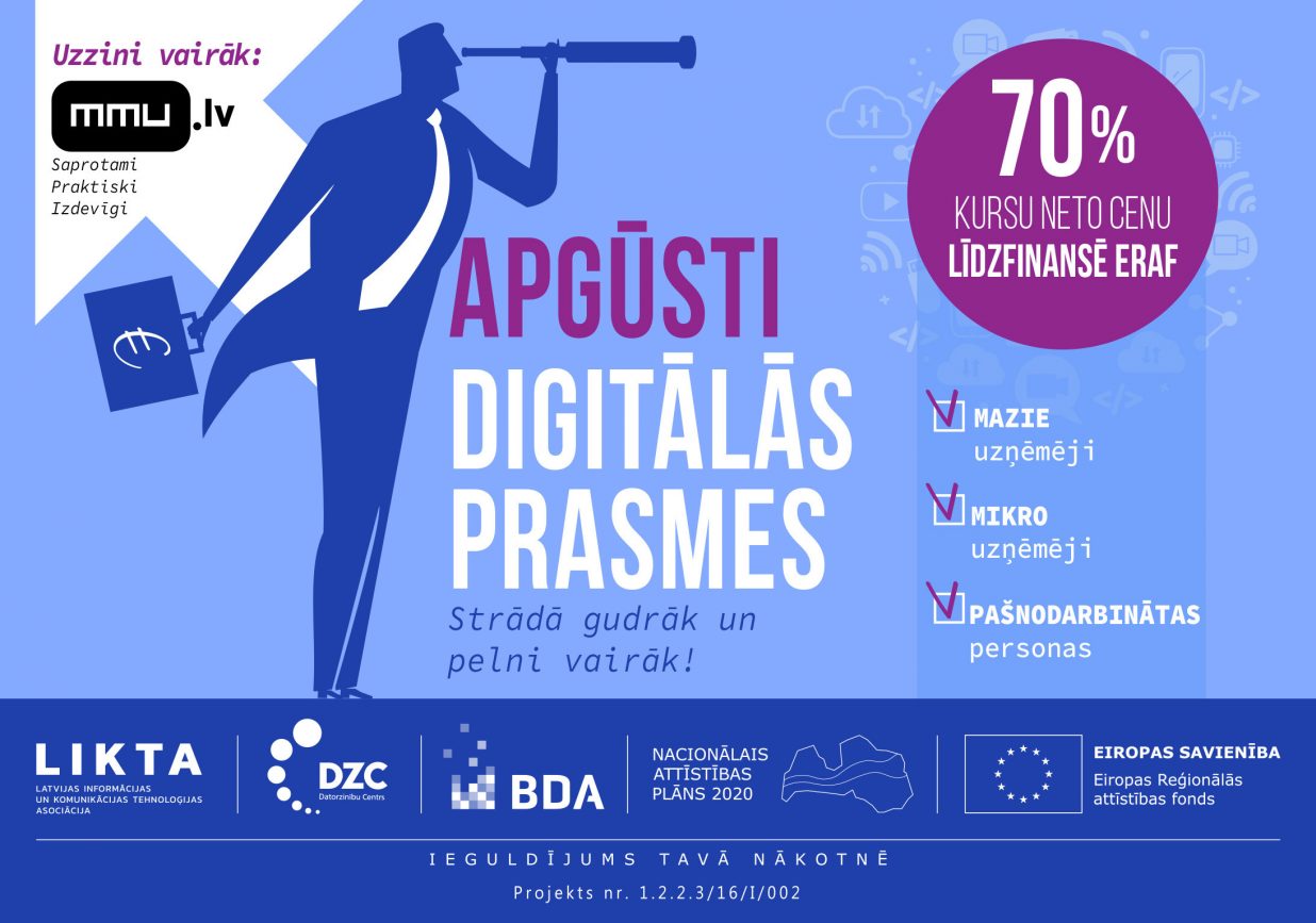 Proti, izvēloties jebkuru no projekta “Mazo un mikro komersantu apmācības inovāciju un digitālo tehnoloģiju attīstībai Latvijā” (MMU) apmācībām digitālajā jomā, ir iespēja apgūt prasmes un zināšanas latviešu valodā pēc metodiski sagatavotiem materiāliem gan tiešsaistē, gan klātienē lētāk. ERAF līdzfinansējums apmaksā 70% no kursu neto cenas.