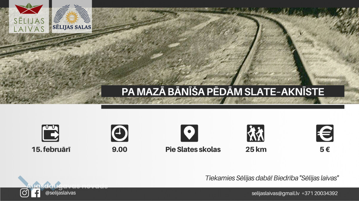 Pārgājiens notiks 15. februārī. Tikšanās vieta: Slates skola, plkst. 9.00. Ģērbšanās atbilstoši laika apstākļiem. Vēlami mitrumizturīgi apavi. Transports no Aknīstes uz Slati pēc pārgājiena tiks nodrošināts. Dalības maksa: 5 EUR. Sīkāka informācija pa tālruni 28616357 (Santa).