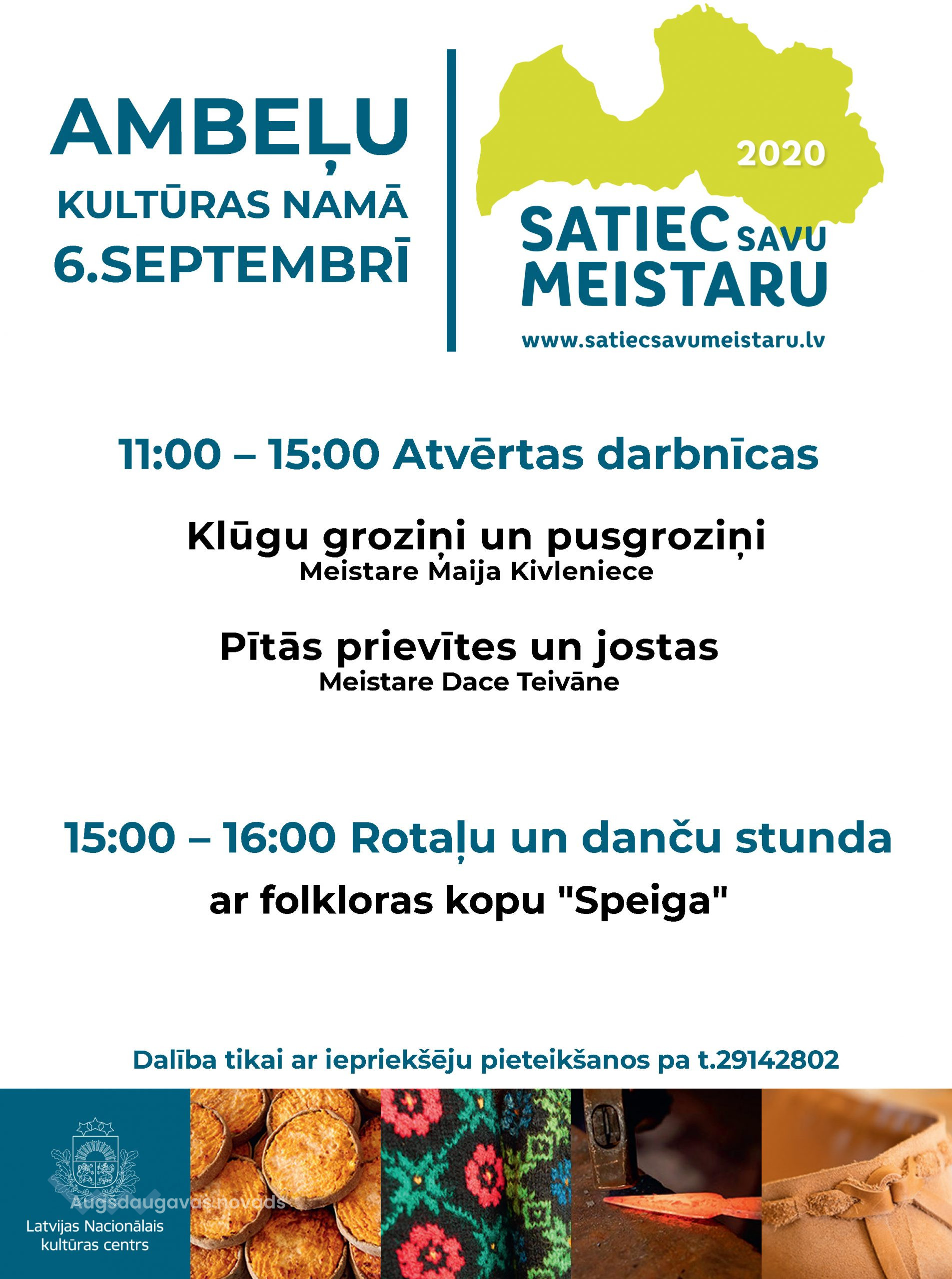 06. septembrī plkst. 11.00 - 15.00 Ambeļu kultūras namā (Parka iela 3, Ambeļi, Daugavpils novads) norisināsies klūgu, prievīšu un jostu pīšanas prasmju apgūšanas pasākums "Satiec savu meistaru! 2020". Nodarbības vadīs meistari Maija Kivleniece un Dace Teivāne. Dalība ir iespējama tikai ar iepriekšējo pieteikšanos! Maksimālais dalībnieku skaits – 30 cilvēki. No plkst. 15.00 - 16.00 norisināsies rotaļu un danču stunda ar folkloras kopu „SPEIGA”. Informācija un pieteikšanās pa tālruni: Ingrīda Skutele, 29142802; vai e-pastu: skuteleingrida@inbox.lv
