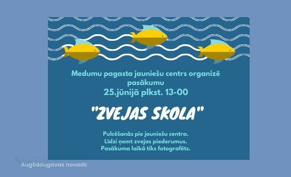 25. jūnijā plkst. 13.00 Medumu pagasta jauniešu centrs organizē pasākumu "Zvejas skola". Pulcēšanās pie jauniešu centra. Līdzi ņemt zvejas piederumus.