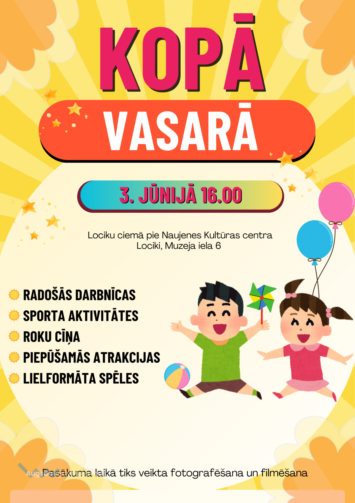 3. jūnijā plkst.16.00 aicinām bērnus uz aizraujošu pasākumu pie Naujenes Kultūras centra (Muzeja iela 6, Lociki)! Sagaidāmas jautras atrakcijas, spēles un lieliska atmosfēra!