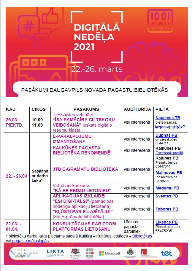 Latvijas Informācijas un komunikācijas tehnoloģijas asociācija (LIKTA) sadarbībā ar Vides aizsardzības un reģionālās attīstības ministriju (VARAM) 2021. gadā no 22. līdz 26. martam organizē Eiropas Digitālo nedēļu Latvijā.