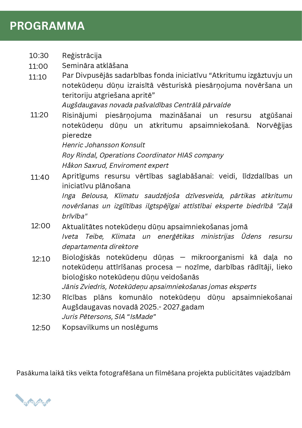 Aicinām pašvaldību vides speciālistus, komunālās saimniecības uzņēmumu pārstāvjus un citus interesentus piedalīties seminārā un iepazīties ar Divpusējās sadarbības fonda iniciatīvas “Atkritumu izgāztuvju un notekūdeņu dūņu izraisītā vēsturiskā piesārņojuma novēršana un teritoriju atgriešana apritē” ietvaros īstenotajām aktivitātēm. Norvēģijas vides speciālisti dalīsies pieredzē, akcentējot ilgtspējīgu risinājumu ieviešanu piesārņojuma mazināšanai un aprites ekonomikas veicināšanai. Seminārā arī tiks sniegta informācija par notekūdeņu dūņu apsaimniekošanas aktualitātēm Latvijā, un iekļautas tēmas par aprites ekonomikas principiem resursu saglabāšanā, notekūdeņu dūņu lomu bioloģiskos attīrīšanas procesos. ! ! ! Lai piedalītos seminārā, lūdzam reģistrēties līdz 2024.gada 19.novembrim šeit.