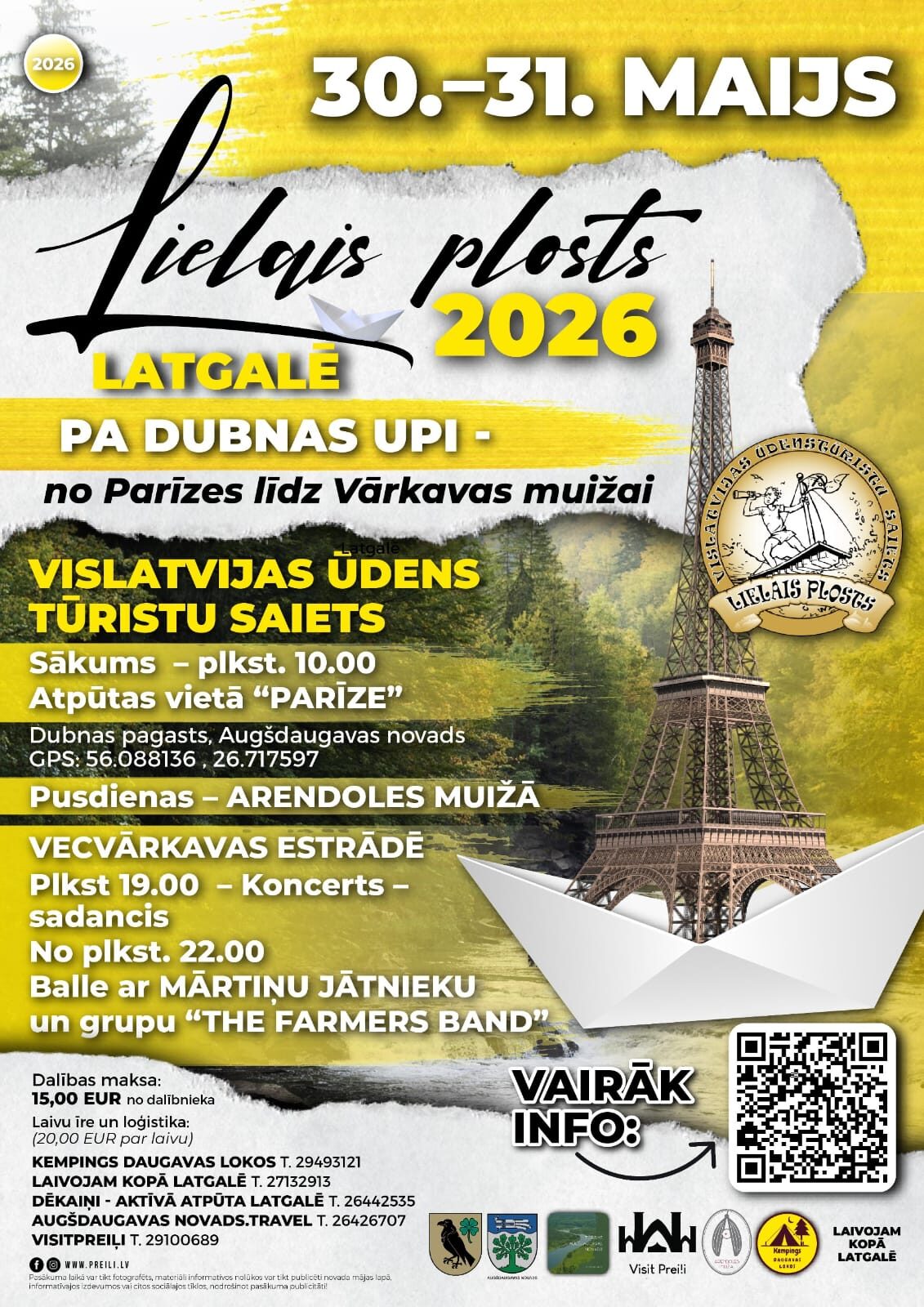 2026. gada 30. – 31. maijā Dubnas upē starp Parīzi un Vārkavas muižu norisināsies jau tradicionālais Vislatvijas ūdens tūristu saiets “Lielais plosts”, kas pulcē ūdens tūrisma entuziastus un profesionāļus no visas Latvijas un tuvākām ārzemēm.
