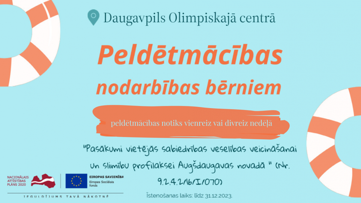 Īstenojot ESF projektu “Pasākumi vietējās sabiedrības veselības veicināšanai un slimību profilaksei Augšdaugavas novadā " (Nr. 9.2.4.2/16/I/070), Augšdaugavas novada pašvaldības centrālā administrācija aicina pieteikties bezmaksas peldētmācības nodarbībām bērniem.