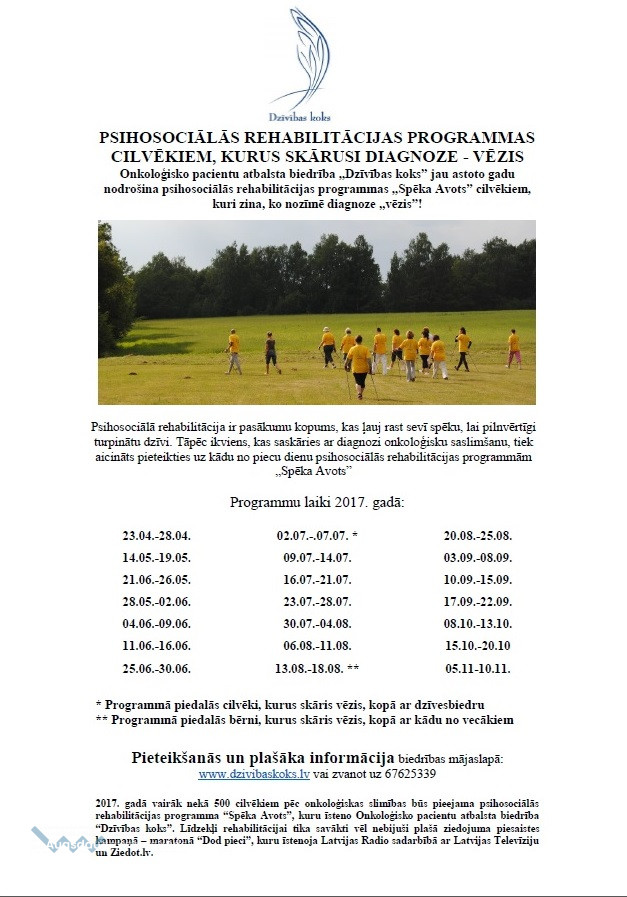 Biedrība “Dzīvības koks” aicina cilvēkus, kuri zina, kā tas ir - izdzirdēt diagnozi “ļaundabīgs audzējs”, kad vienā mirklī dzīve sagriežas bezcerības, baiļu un vēlmes dzīvot mutulī, pieteikties psihosociālās rehabilitācijas programmā “Spēka Avots”. Programma ir pasākumu kopums, kas sniedz pārbaudītu un profesionālu informāciju par onkoloģiju, dod iespēju tikt galā ar emocionālo pārdzīvojumu, kas radies slimības dēļ, kā arī ļauj uzzināt, kā iespējams turpināt dzīvot pilnvērtīgi – gan psihoemocionāli, gan praktiski. Programma (nometne) notiek 5 dienu garumā, tā ir ļoti intensīva, kurā kā grupu vadītāji un lektori piedalās psihoterapeiti, psihologi, mākslas terapeiti, onkologi, imunologi, fizioterapeiti un citi ar onkoloģijas nozari saistīti speciālisti.