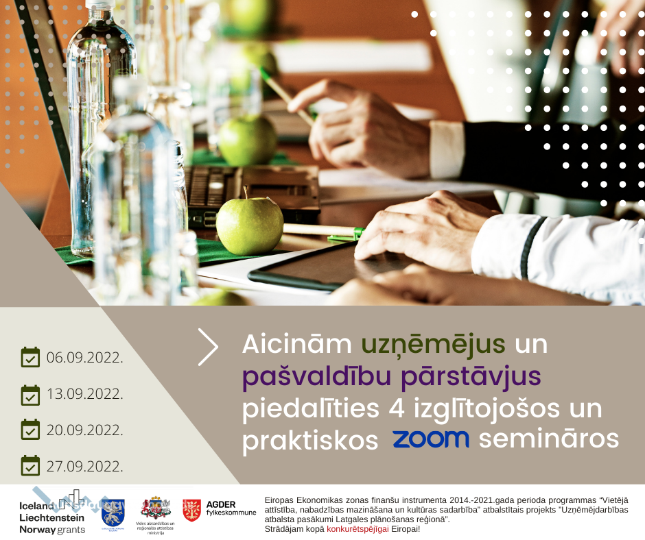 Semināru norises datumi un tēmas: 06.09.2022. “Zīmols-instruments uzņēmējdarbības efektīvai pozicionēšanai tirgū” (no 10.00 līdz13.00); 13.09.2022. “Digitālās platformas darba nodrošināšanai attālināti – praktiskas iespējas un lietošanas ētika” (no 10.00 līdz13.00); 20.09.2022. “Aplikācijas efektīvai uzņēmuma pārvaldībai lietvedībā un grāmatvedībā, izmantojot pašapkalpošanās sistēmu” (no 10.00 līdz13.00); 27.09.2022. “Pašnodarbinātība – veiksmīgas uzņēmējdarbības forma” (no 10.00 līdz13.00);