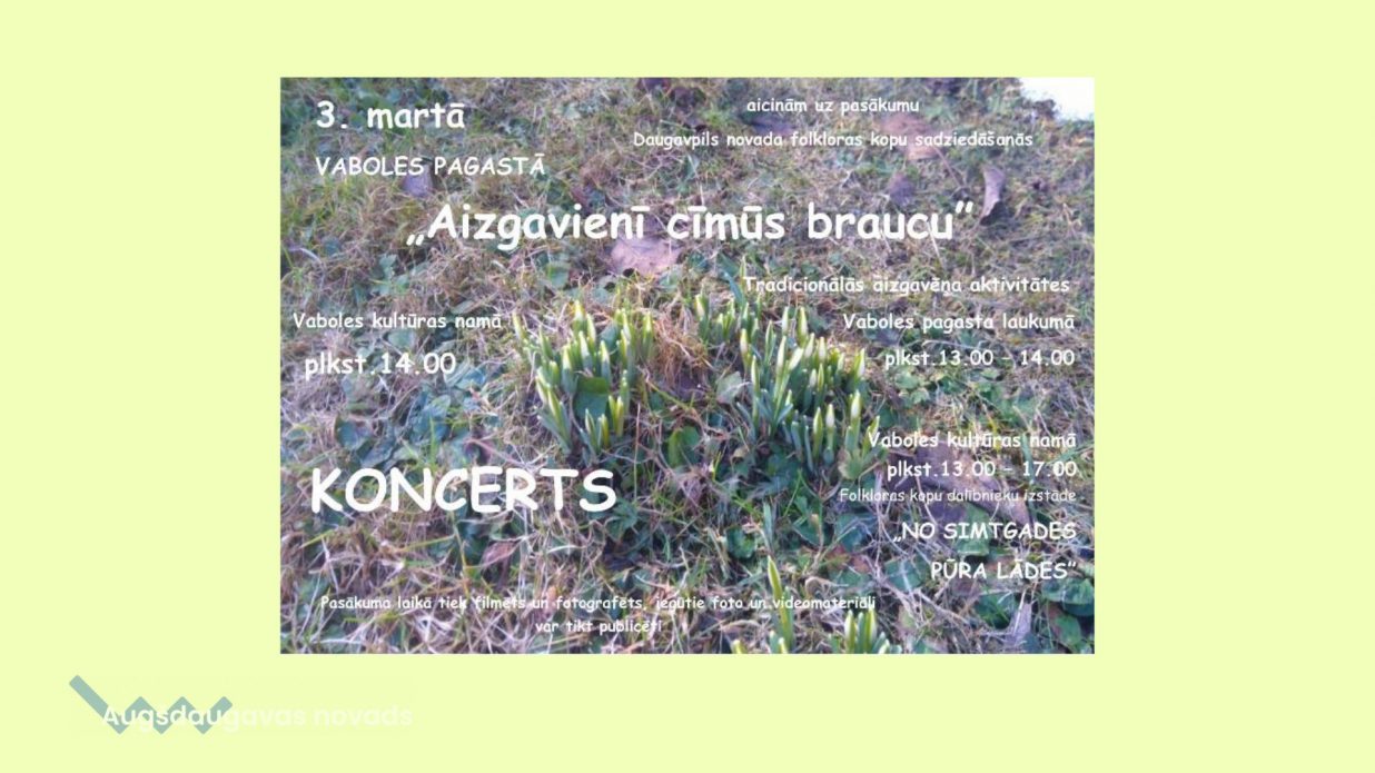 Aicinām apmeklēt ikgadējo folkloras kopu sadziedāšanās pasākumu „Aizgavienī cīmūs braucu. ..” 3. martā Vaboles kultūras namā.