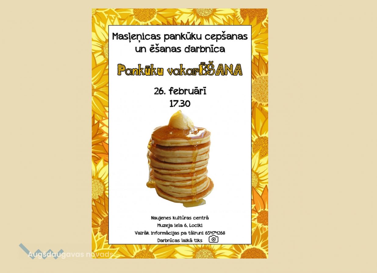 Lai būtu vēl gardāk, piedāvājam līdzi paņemt to, ar ko jūs parasti pankūkas ēdat – tie var būt augļi, ievārījums, krējums, iebiezinātais piens… vienvārdsakot – jebkuru jūsu iemīļoto pankūku piedevu, ar kuru jūs labprāt dalītos arī ar pārējiem. Gaidīsim jūs 26. februārī plkst. 17.30, Naujenes kultūras centrā.
