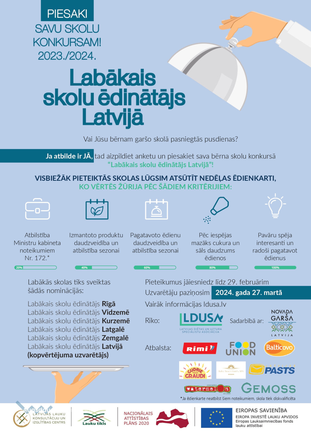 Aicinām informēt vecākus, kā arī izvietot skolā redzamā vietā pievienoto plakātu, ar informāciju par Latvijas Diētas un Uztura Speciālistu asociācijas (LDUSA) organizēto konkursu “Labākais skolu ēdinātājs Latvijā” 2023./2024. mācību gadā.