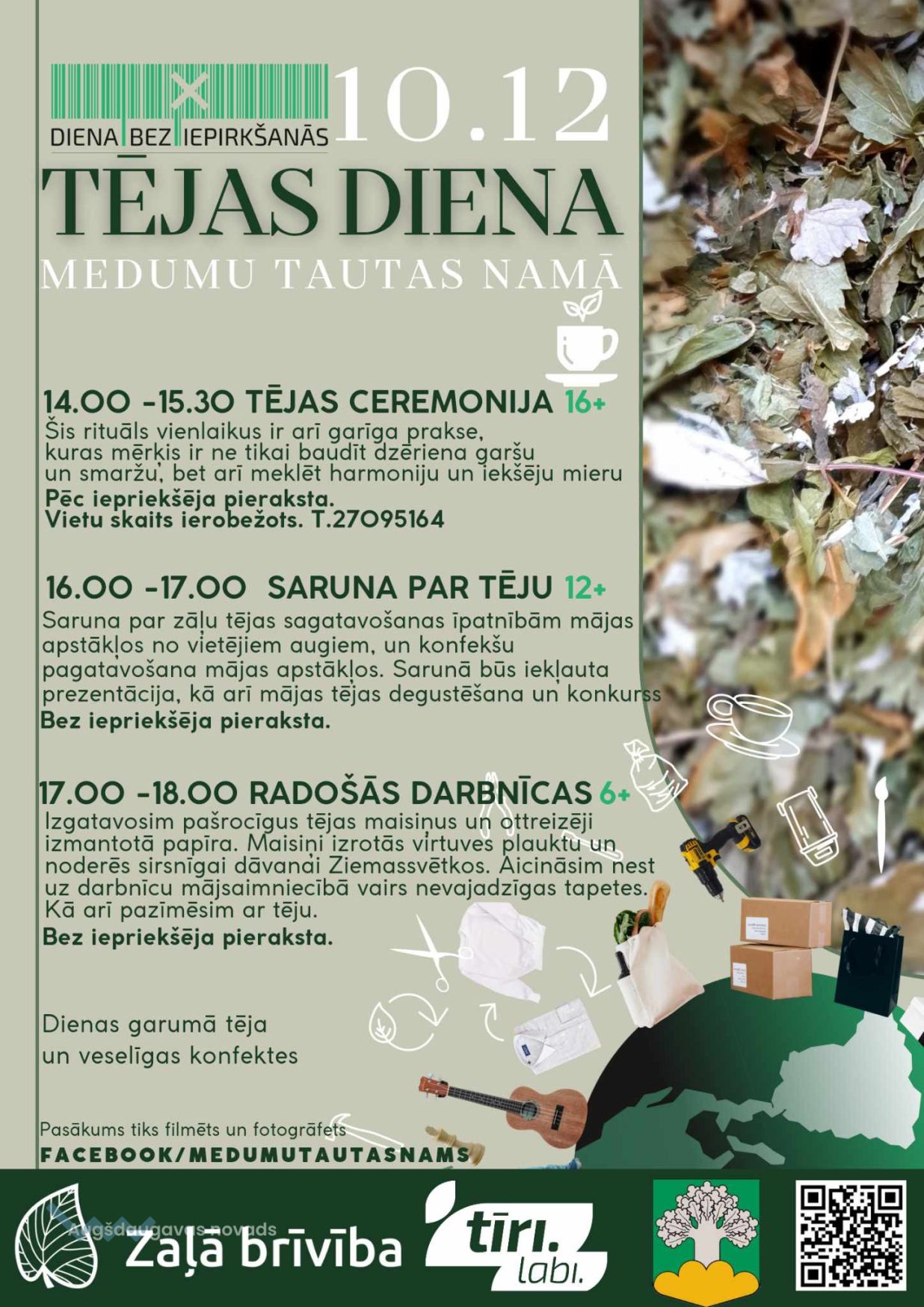 Tāpēc gribam izgaismot šo laiku ar pasākumu "TĒJAS DIENA" Medumos, kurā būs iespēja iemācīties pašiem radīt dāvanas apgūstot papīra otrreizēju izmantošanu. Uzzināt daudz lietderīgas informācijas, kā no vietējiem augiem mājās pagatavot sev zāļu tēju, kā arī iedziļināties unikālajā Tējas ceremonijas mākslā, protams, arī pavadīt laiku jēgpilnās sarunās, mājīgā atmosfērā Medumu Tautas namā.