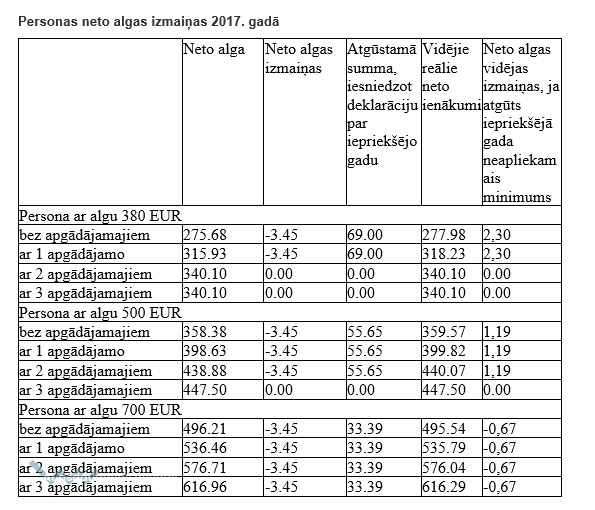Tādējādi personām, kuru mēnešalga, piemēram, ir 380 eiro mēnesī, 2016. gadā neto ienākums (ienākums pēc nodokļiem) nemainīsies. Savukārt 2017. gadā piemērotais minimālais mēneša neapliekamais minimums gan samazināsies par 15 eiro (no 75 eiro līdz 60 eiro), kā rezultātā taksācijas gada neto ienākums samazināsies par 41,40 eiro (t.i., 3,45 eiro mēnesī). Taču, iesniedzot gada ienākumu deklarāciju par 2016. (taksācijas) gadu, persona būs tiesīga saņemt iedzīvotāju ienākuma nodokļa atmaksu 69 eiro apmērā. Tādējādi faktiski personas neto ienākums 2017. gadā pieaugs par 27,60 eiro.