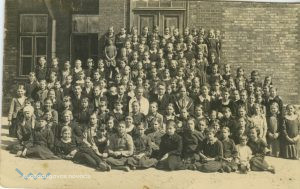 Vaboles sešklasīgās pamatskolas skolnieki pie skolas, vidū skolas pārzinis A. Rubenis, 1939.g. Foto: Skrindu dzimtas muzeja krājums