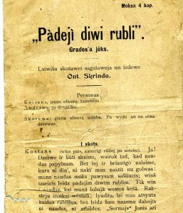 A.Skrindas luga ''Pādejī diwi rubļi'' (1907). Skrindu dzimtas muzeja krājums..A. Skrinda 1908.gadā izdotā gramatika latgaliešu valodā. Skrindu dzimtas muzeja krājumsSkrindu dzimtas muzeja vecākā speciāliste Ilze Ozoliņa