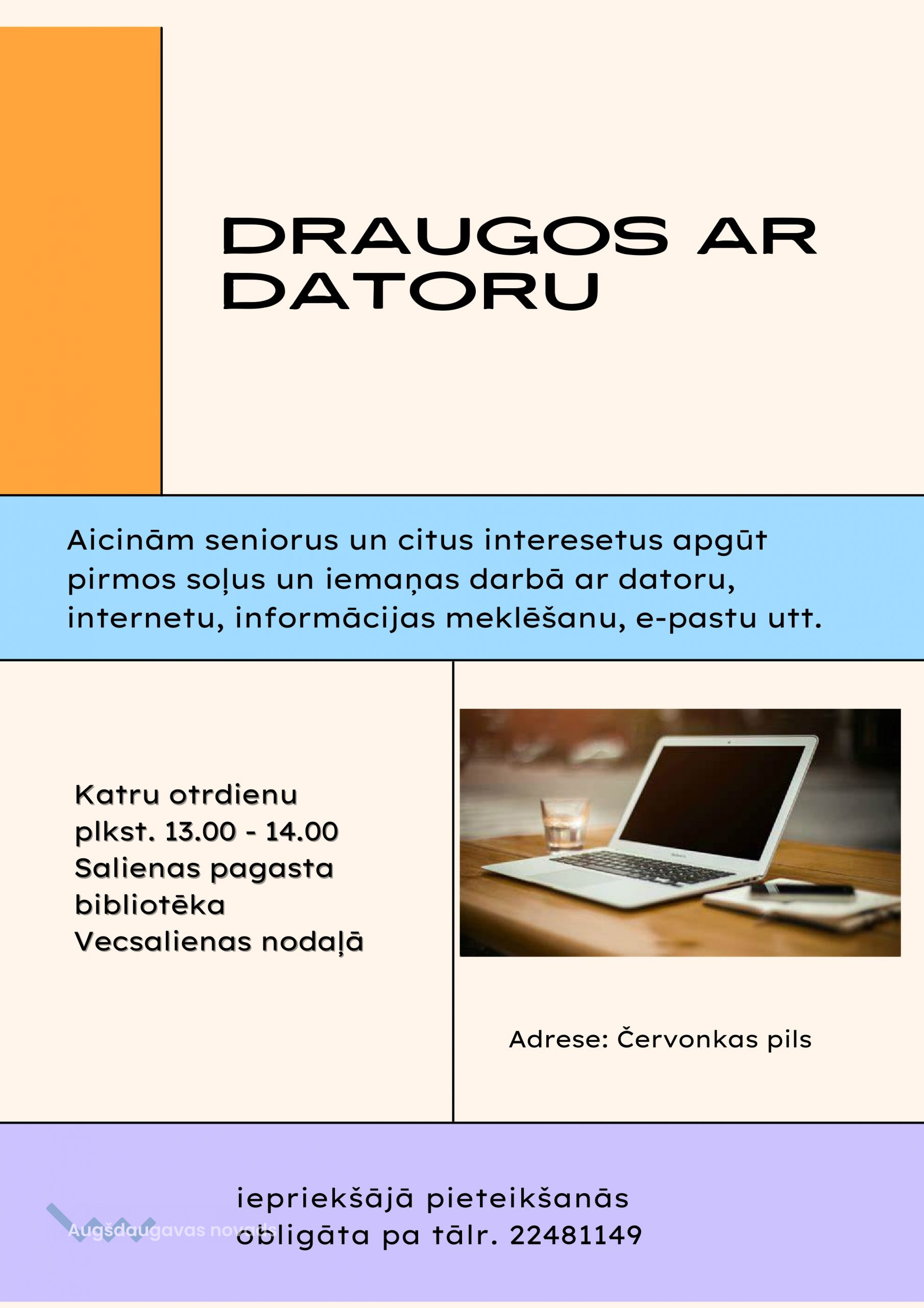 Laipni lūgti seniori un visi interesenti Salienas pagasta bibliotēkā un Salienas pagasta bibliotēkas Vecsalienas nodaļā apmācībai “Draugos ar datoru”. Mēs piedāvājam apgūt pirmos soļus un iemaņas darbā ar datoru, internetu, informācijas meklēšanu, e-pastu, Facebook utt.