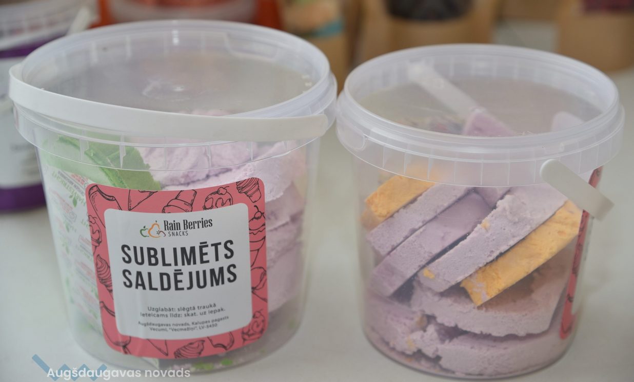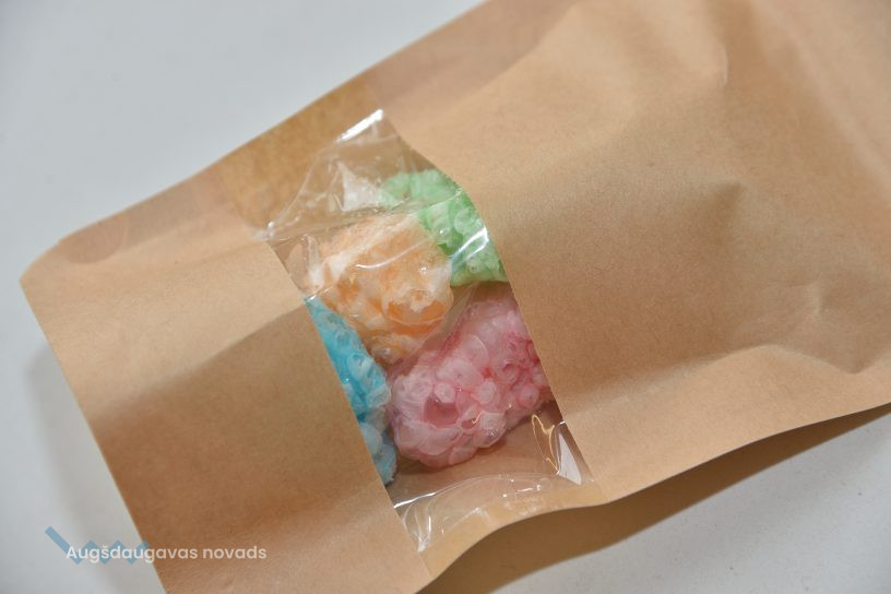 Eksperimentējot pamēģinājuši izkaltēt arī pirkto sieru, kas sanāk gards kā čipsi, tāpēc ir doma gatavot Jāņu dienas našķus. Izrādās, sublimēt var pat saldējumu, kas gatavā veidā izskatās pēc zefīra, taču ir kraukšķīgs un mutē kūstošs gardums. “Es jau sievai saku, ka ielikšu iekšā savu čību paskatīties, kāda tā sanāks,” smejas Normunds un rāda iesaiņojumu ar krāsainiem popkornam līdzīgiem kraukšķiem. Tas ir viens no saimnieku eksperimentiem, kas īpaši garšojot bērniem, - sublimētas želejkonfektes.