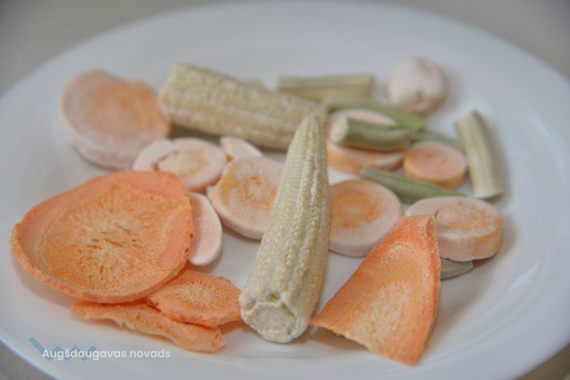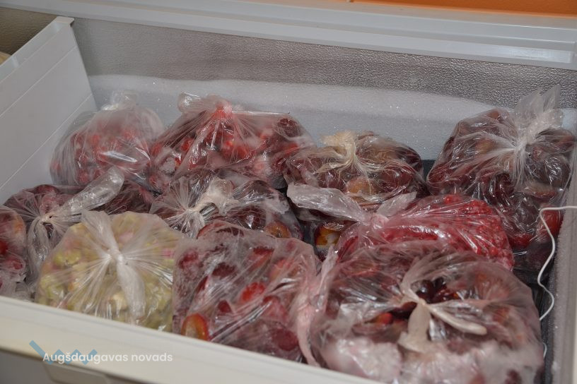 Iekārtas darbojas vien mēnesi, bet ražošanas telpā jau kastēs krājas jaunā produkcija. Tā fasēta gan īpašos papīra iepakojumos, gan plastmasas spainīšos, no kuriem pretī kārdinoši raugās zemenes, avenes, kivi, plūmes un citi pašmāju un eksotiskie gardumi. Lielākoties iekārtās nonāk pašu dārza raža, tostarp daudzveidīgi dārzeņi, ko var grauzt tāpat vai likt zupās. Normunds stāsta, ka izkaltētie dārzeņi vai augļi, nonākot ūdenī, piebriest un garšojot kā nupat plūkti dārzā. “Ja zupu uzreiz neapēd, uzlej uz paplātes un liec iekārtā, tad maisiņā un pēc tam atkal vari ēst.” Burkānus mēģina kaltēt dažādā formā – gan salmiņos, gan kā čipsus graušanai. Ļoti izteikta garša ir rabarberu čipsiem, tos gan pirms kaltēšanas izmērcē cukura sīrupā. Visgrūtāk kaltējas ogas ar vaska kārtiņu – dzērvenes, mellenes, brūklenes, tās pirms kaltēšanas vajag fiziski traumēt, pāršķeļot miziņu, lai kaltējot mitrums tiek laukā, tāpēc talkā nāk parastā grila tīrīšanas birste vai zirgu suka.