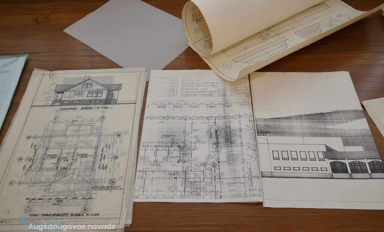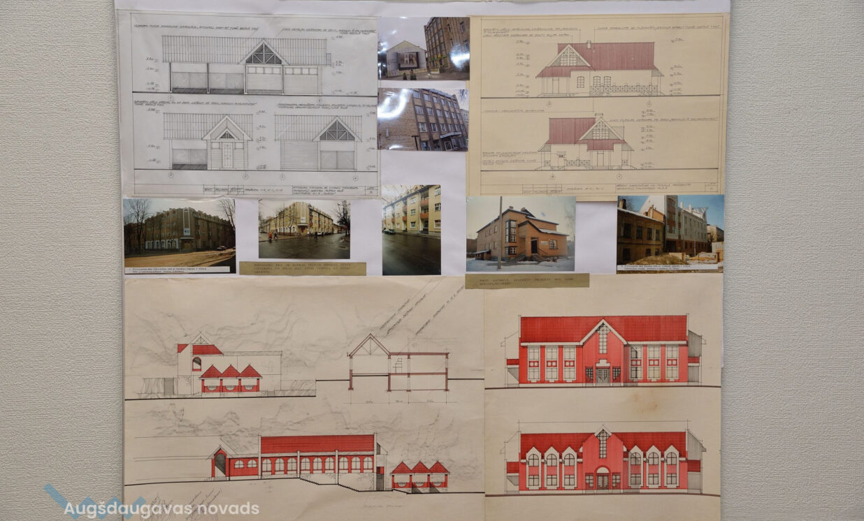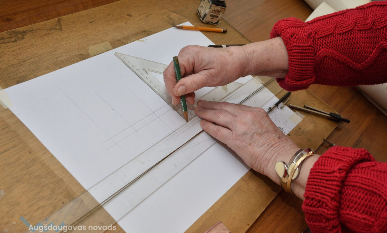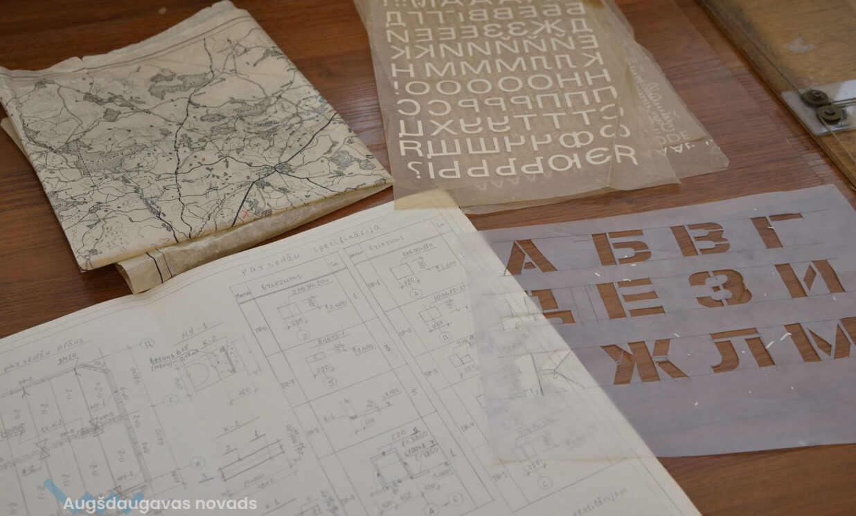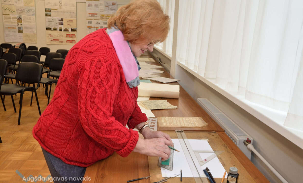 “Esam no pagājušā gadsimta, palikuši pēdējie, kas vēl rasē ar roku, jo jau gadus 20 tas tiek darīts ar datoru, tāpēc gribējām parādīt tās tehnikas un iespējas, ar kurām mēs strādājam,” teic Ģertrūde, kura arhitektes gaitas uzsāka 1974. gadā. Uz viena no stendiem redzama viņas diplomdarba titullapa, rakstīta ar roku ideāli glītā drukas rakstā, kas tapis ar šablonu palīdzību. Nezinātājs noteikti nodomātu, ka tas ir datorraksts. Augstskolā Ģertrūde apguvusi vairākus rokraksta veidus, ko agrāk izmantojusi ne tikai darbā, bet arī dažādu ielūgumu, apsveikumu un galda karšu izgatavošanā. “Mums studijās divus gadus bija burtu mācība, bija jāapgūst desmit šrifti – gotu, kaligrāfiskais, tehniskais, speciālais drukāšanas šrifts, arhitektoniskais un bija jāizdomā personīgais šrifts. Rakstāmmašīna bija jau solis uz priekšu. Kad atnācu strādāt, mums bija drausmīga klaboša mašīna, uz kuras mēs drukājām. Projektēšanu toreiz sākām ar četru krāsu zīmuļu komplektu. Tika izmantoti dažnedažādi varianti, mēs gan šķīdinājām kālija permanganātu, lai dabūtu brūnus toņus, gan akvareļkrāsas izmantojām. Vēlāk, pēc gadiem 10, parādījās flomāsteri, tad bliezām visu sarkanu, cik vien var krāsainu visu, oranžu. Arī materiāli agrāk tika izmantoti dažādi – papīrs, lavsāns, impregnēts audums.” Interesanti, ka visas dokumentu kopijas agrāk tika veidotas bez kopējamām mašīnām, jo tādu nemaz nebija. Kartes tika izgatavotas vairākos eksemplāros. “Kad sāku strādāt, kopijas tika taisītas ļoti interesantā veidā. Mēs rasējām uz caurspīdīgajām tušas un zīmuļu pauzēm, pēc tam tās izgaismojām, likām kastē, kur apakšā bija lampas, virsū bija stikls, uz kura uzlikām savu rasējumu un virsū gaismas jūtīgo papīru. Minūtes 5-10 turējām, pēc tam sarullējām, un sekretāre ātri skrēja uz speciālo melno kabinetu, kur vienā skapī lika šos rasējumus, kas attīstījās ar ožamo spirtu. Tautas valodā tās sauca par siņkām. Bija arī cits veids – ar zīmuli rasēto caur stiklu uz kaļkas pārvilka ar tušu,” Ģertrūde aizraujoši stāsta par dažādām tehnoloģijām, ko arhitekti agrāk pielietoja savā ikdienas darbā.