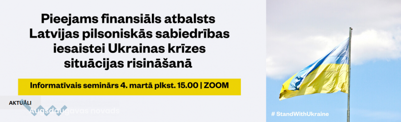 Aktīvo iedzīvotāju fonds (AIF) sadarbībā ar Sabiedrības integrācijas fondu (SIF) aicina uz semināru par finansiālā atbalsta iespējām Latvijas nevaldības organizācijām, kas vēlas iesaistīties Ukrainas krīzes situācijas risināšanā. Seminārs notiks 2022. gada 4. martā plkst. 15.00 Zoom platformā.
