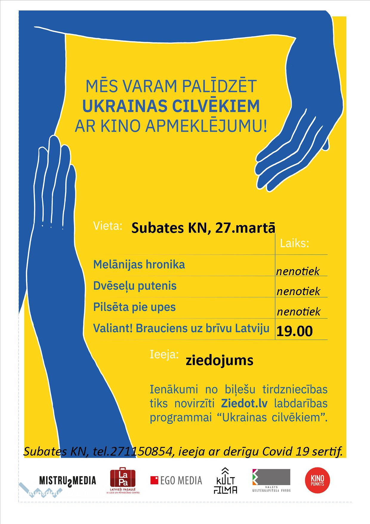 27. martā plkst. 19.00 Subates kultūras nama ilggadējs sadarbības partneris "Kinopunkts" piedāvā iespēju noskatīties filmu un ziedot Ukrainas atbalstam.
