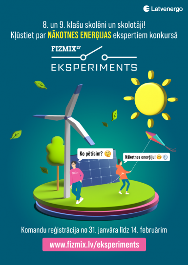 Līdz 14. februārim 8. un 9. klašu skolēni un skolotāji aicināti pieteikt komandas AS "Latvenergo" rīkotajam fizikas erudīcijas konkursam "FIZMIX Eksperiments". Konkursa galvenais temats šogad ir nākotnes enerģija. Par to aicinās domāt eksperti un Latvijas uzņēmēji, kuru panākumus ir veidojušas zināšanas par fiziku un atjaunīgo enerģiju. Savukārt skolotāji aicināti sacensties par "FIZMIX Skolotājs 2022" titulu.