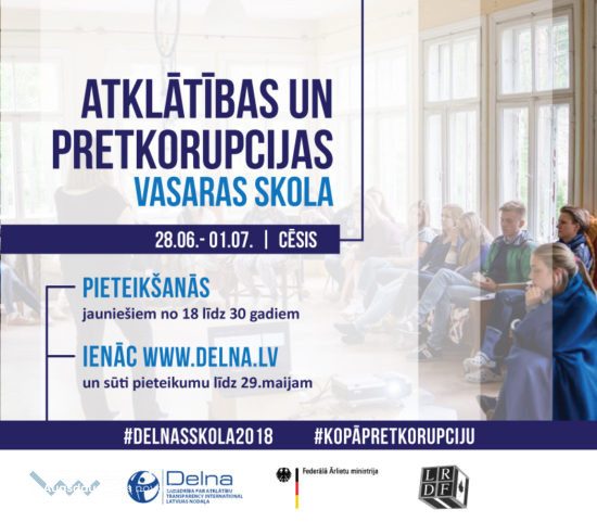 Delnas ATKLĀTĪBAS UN PRETKORUPCIJAS VASARAS SKOLA 2018 norisināsies Cēsīs, Ruckas muižā no 28. jūnija līdz 1. jūlijam. Aicinām pieteikties jauniešus vecumā no 18 līdz 29 gadiem, kam ir pastiprināta interese par korupcijas mazināšanu! Tiks segtas visas uzturēšanās, ēdināšanas un transporta izmaksas. Reģistrācija līdz 29.maijam. Vairāk informācijas te: https://delna.lv/lv/2018/05/22/delna-aicina-jauniesus-pieteikties-atklatibas-un-pretkorupcijas-vasaras-skolai-2018/