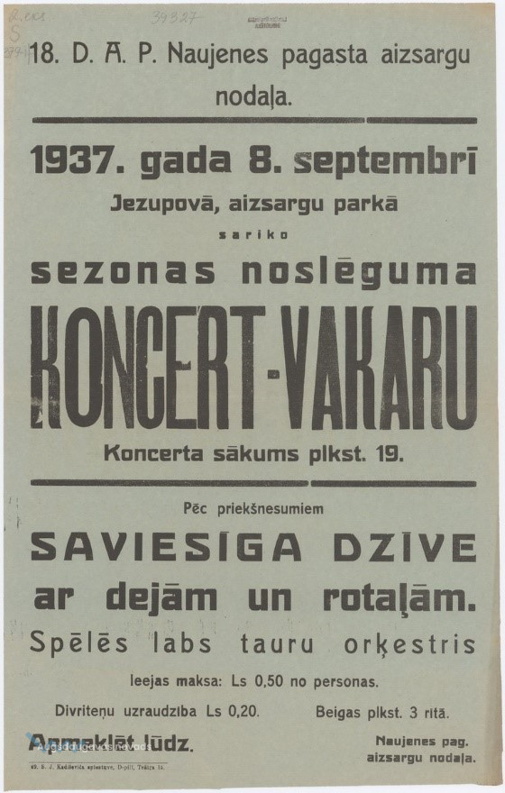 Naujenes pagasta aizsargu nodaļas koncertvakara afiša, 1937