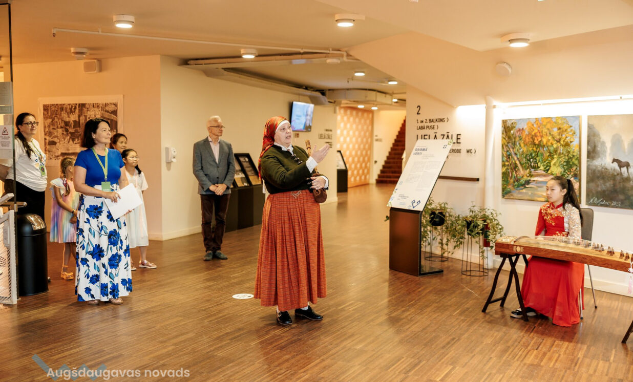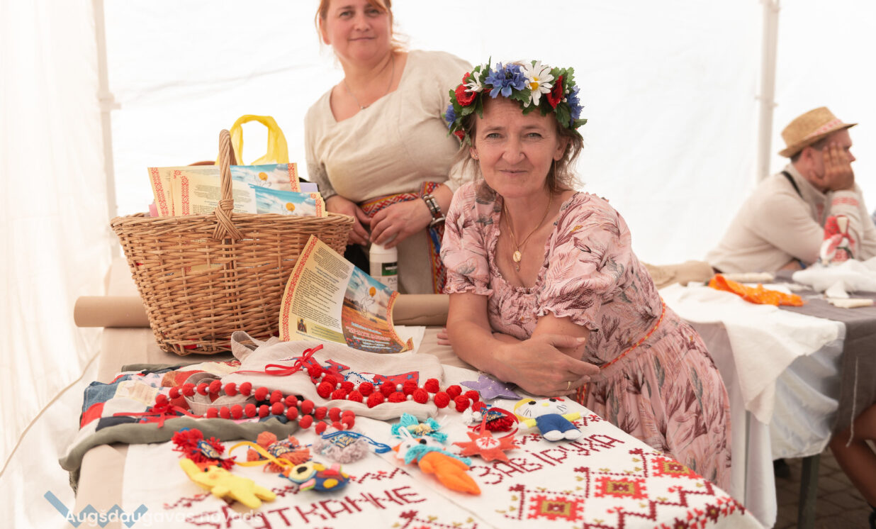 “Lielajā dzintarā” tika atklāta mazākumtautību mākslinieku izstāde "Gaismā vērti". Biedrības “Sadarbības platforma” valdes priekšsēdētāja un izstādes projekta vadītāja Lauma Celma stāsta, ka pirmo reizi šāda izstāde notika pagājušā festivāla laikā Jelgavā. Pieredze bija veiksmīga un arī šoreiz organizatori uzrunāja dažādu jomu māksliniekus: “Gribam paradīt ne tikai dažādo Latvija dzīvojošo tautu iedzīvotāju kultūru kā dziedošu, dejojošu, spēlējošu, bet arī ļoti dažādos un daudzveidīgos darbus, ko viņi dara… Ir kaut kādas ļoti tradicionālas lietas, kas šeit izstādē ir redzamas, bet mēs centāmies šogad parādīt to, kā dažādo tautību cilvēki ienes savu kultūru arī caur dažādiem mākslas darbiem. Vistālākā no mums māksla ir ķīniešu māksla, ko mēs šodien šeit redzam. Ir eļļas, akrila glezniecība, gravīras, keramika, mums ir pinumi, kas gan vairāk būtu kā lietišķa māksla,” stāsta Lauma. Izstādē varēja aplūkot arī slāvu tautām populāras lellītes, ko sauc par oberegiem, rotaslietas un koka traukus, taču pārstāvēti bija arī tādi mākslas virzieni kā kubisms. Savu pienesumu bija devuši arī ukraiņu mākslinieki, kuri, bēgot no kara, ir iedzīvojušies šeit Latvijā.