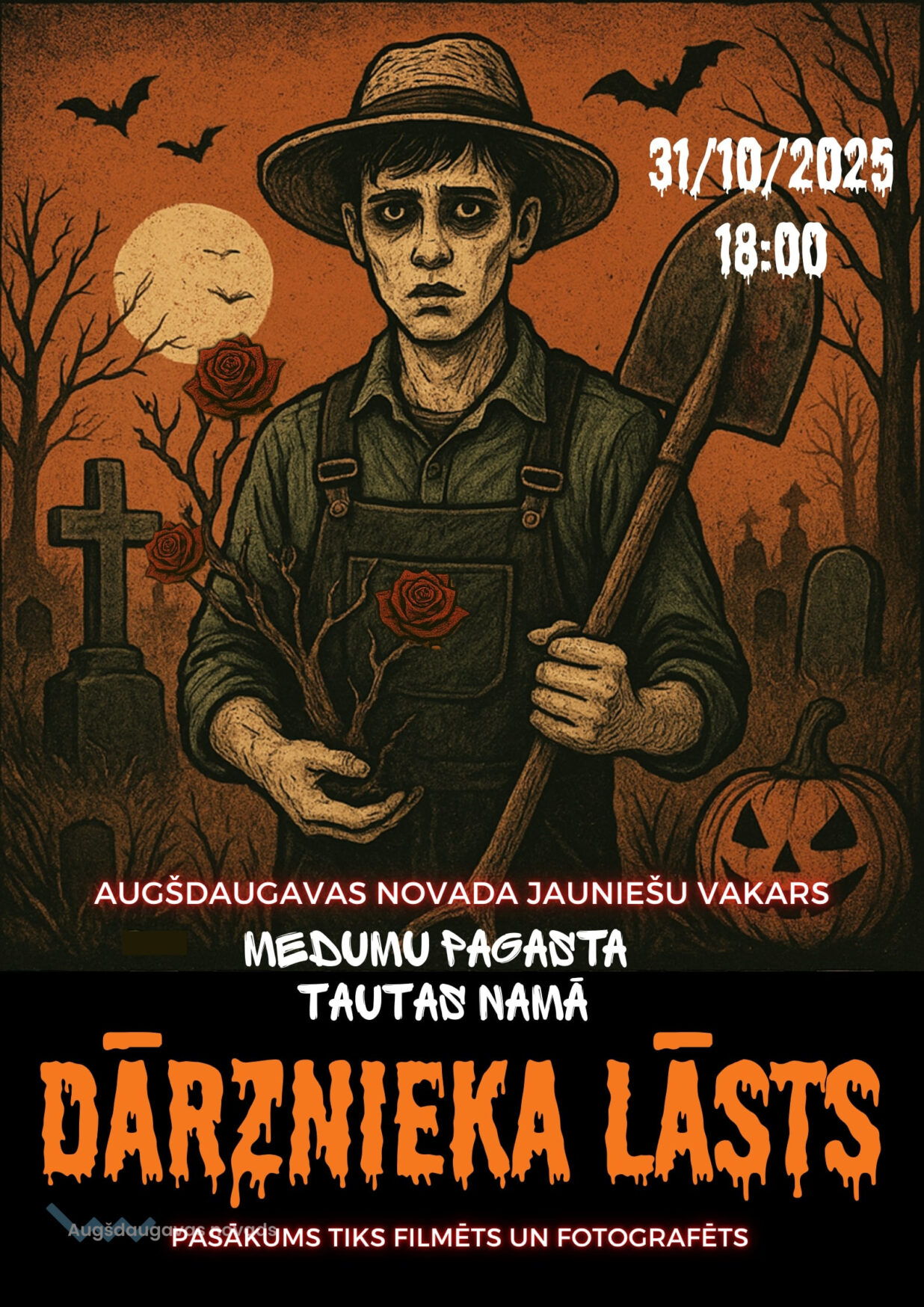 Kalkūnes Jauniešu attīstības centrs kopā ar Kalkūnes, Sventes un Medumu pagastu jauniešiem aicina citu Augšdaugavas novada Jauniešu attīstības centru jaunatni pulcēties gada trakākajā un mistiskajā priekšvakarā, 31.oktobrī, plkst. 18:00 Medumu Tautas namā, kur notiks Augšdaugavas novada jauniešu vakars “Dārznieka lāsts”.