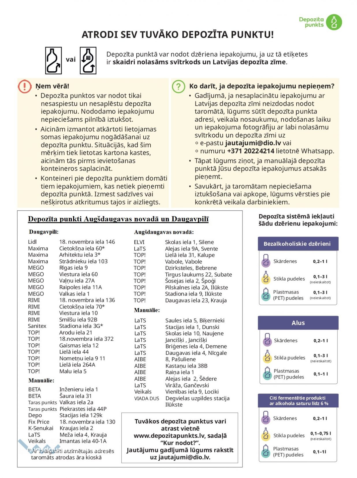 Valsts vides dienests atgādina, ka kopš 2022. gada februāra Latvijā darbojas depozīta sistēma. Augšdaugavas novadā pieejami 10 taromāti un 13 manuālie depozīta punkti.