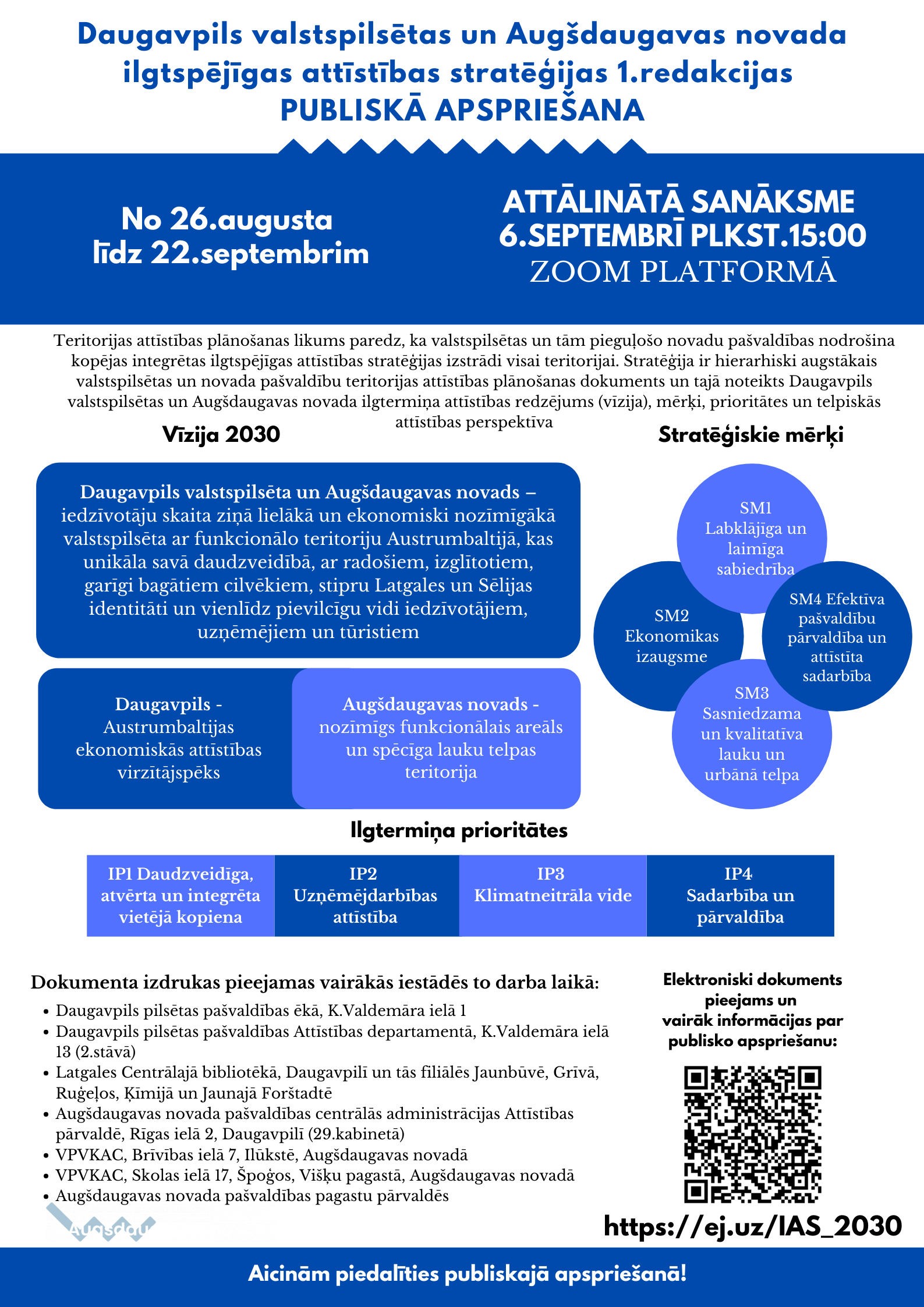 Elektroniskā formātā ar Daugavpils valstspilsētas un Augšdaugavas novada ilgtspējīgas attīstības stratēģijas 1.redakciju var iepazīties: Daugavpils pilsētas pašvaldības mājas lapā www.daugavpils.lv sadaļā “Pilsēta/Pilsētas attīstība”, Augšdaugavas novada pašvaldības mājas lapā www.augsdaugavasnovads.lv sadaļā “Attīstība/Attīstības plānošana”. Dokumenti pieejami arī https://geolatvija.lv/geo/tapis#document_19695