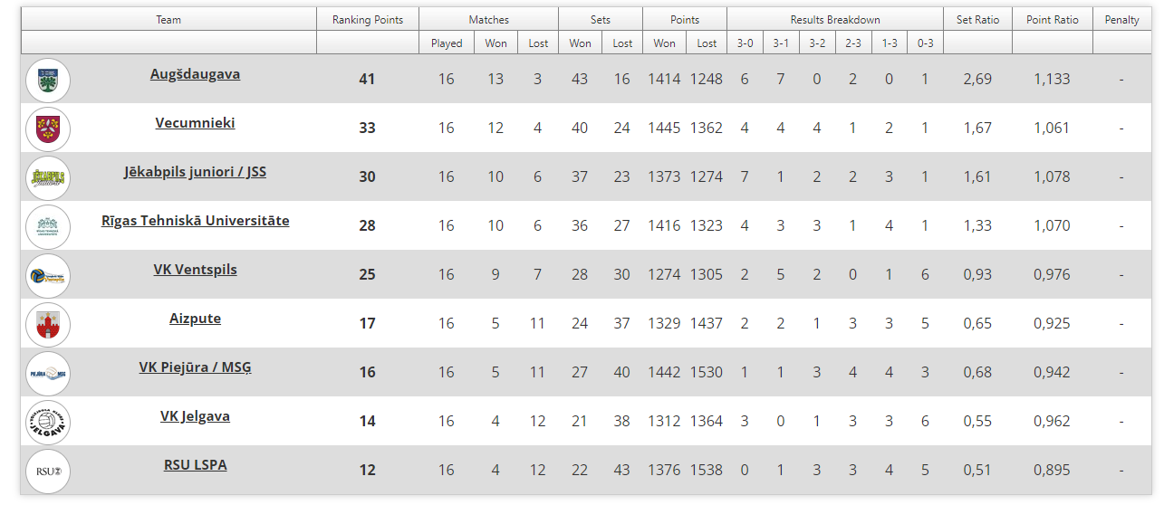 Volejbola komanda "Augšdaugava" ar 41 punktu stabili saglabā 1. vietu turnīrā, 16 spēlēs gūstot 13 uzvaras.