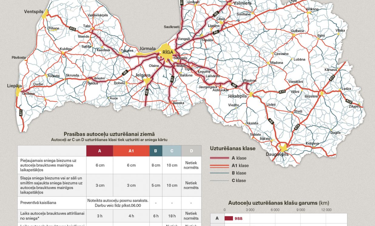 Valsts autoceļiem ziemas sezonā tiek noteiktas piecas uzturēšanas klases – A, A1, B, C un D. Pieļaujamais sniega biezums uz autoceļa brauktuves mainīgos laika apstākļos A un A1 uzturēšanas klases autoceļiem var būt seši centimetri. Savukārt B uzturēšanas klases autoceļiem astoņi centimetri, C uzturēšanas klasei 10 cm, D uzturēšanas klases autoceļiem pieļaujamais sniega biezums netiek normēts.