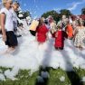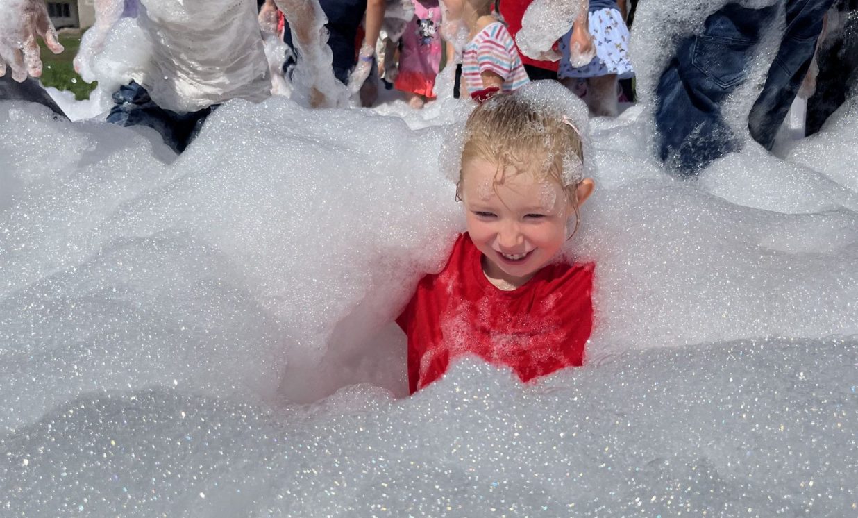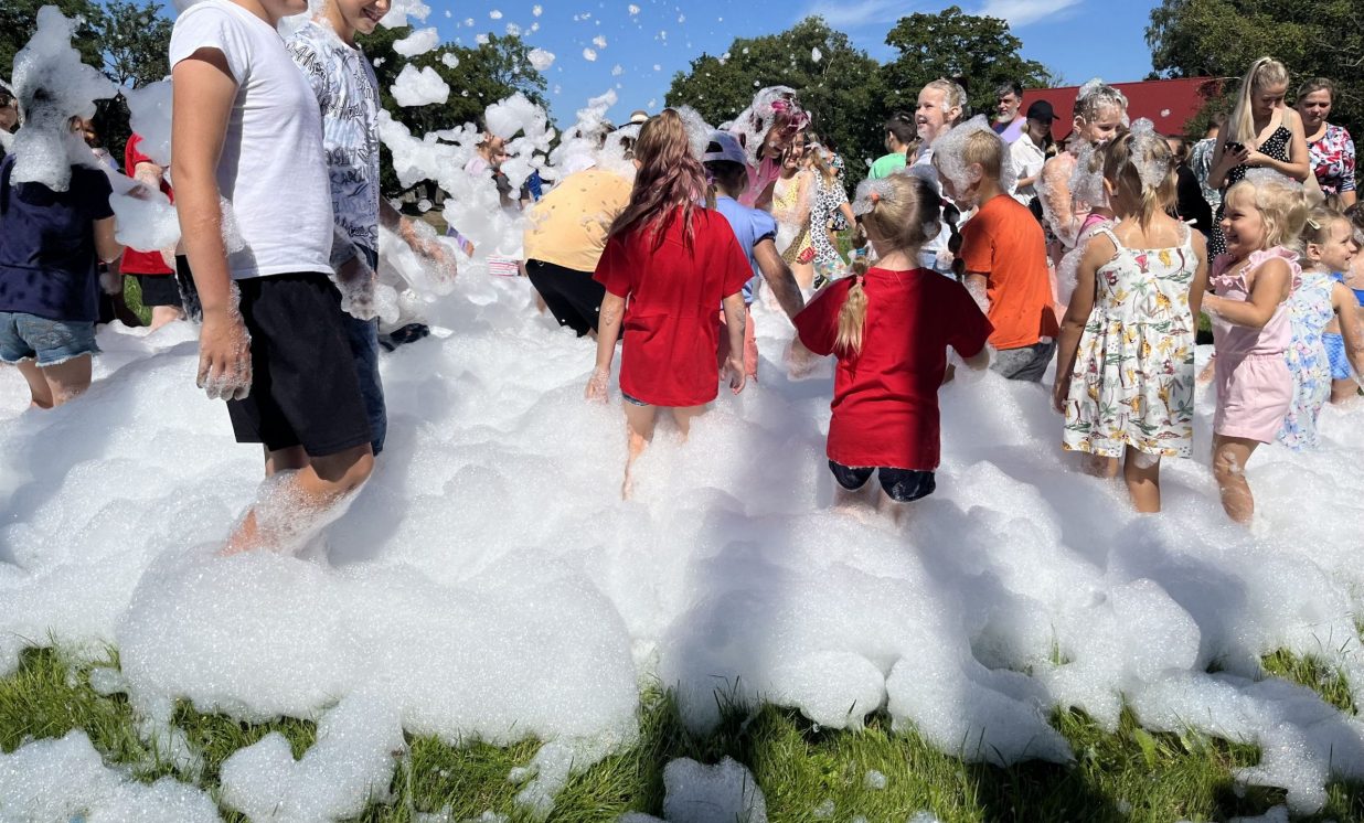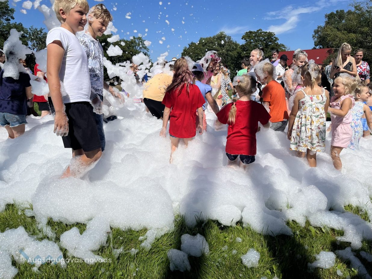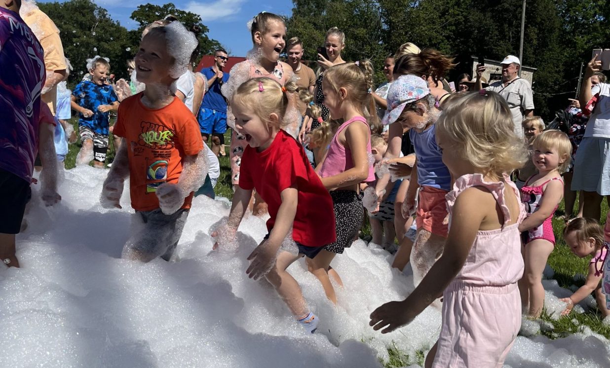 Noguruši, bet priecīgi bērni pievērsās pasākuma kulminācijai – putu ballītei. To nevar izstāstīt, tas bija jāredz – lieli un mazi, smejoši un spiedzoši aiz sajūsmas bērni lielajā putu jūrā!
