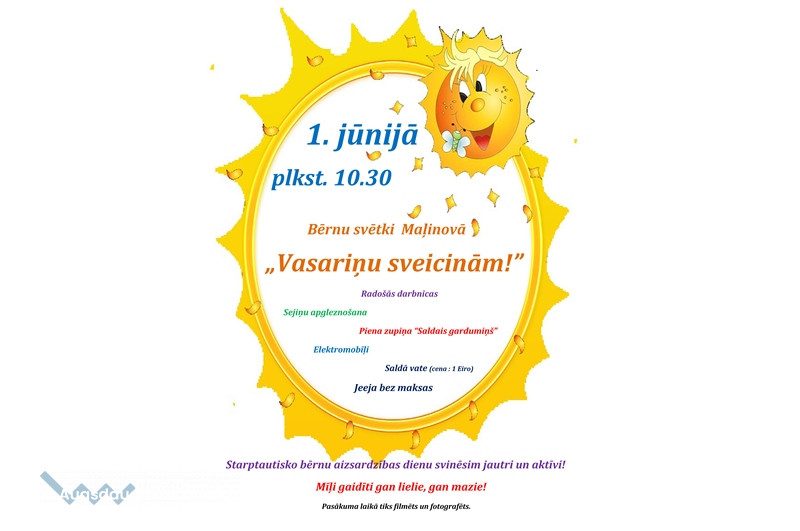 Starptautiskās bērnu aizsardzības dienas ietvaros 1. jūnijā plkst. 10.30 Maļinovas pagasta saieta nams aicina lielus un mazus uz bērnu svētkiem ”Vasariņu sveicinām!”. Pagasta transports nogādās visus interesentus uz svētkiem un atpakaļ! Papildus informācija pagasta informācijas stendos.