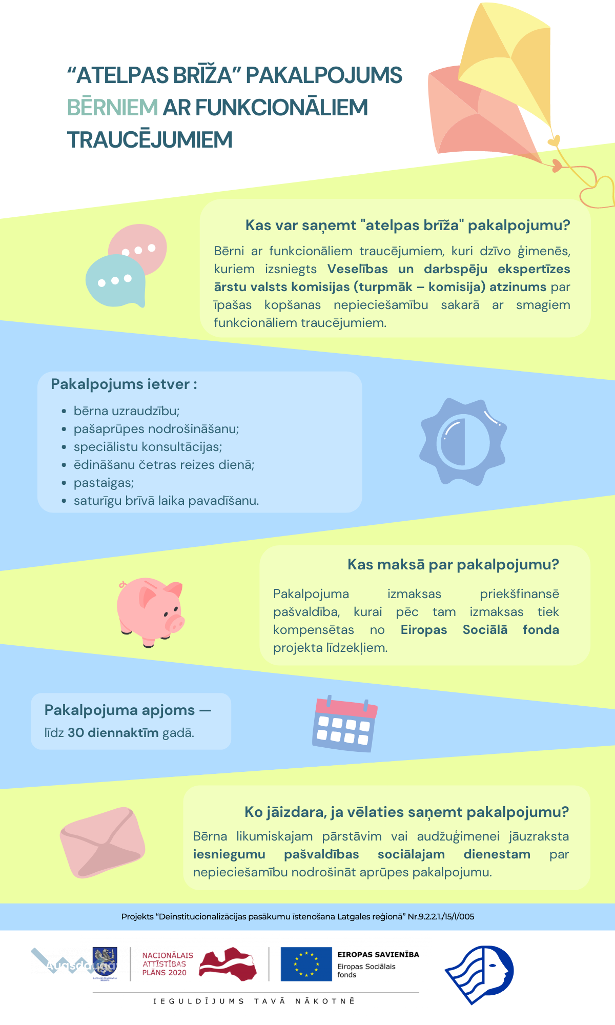 “Atelpas brīža” pakalpojums ir kā diennakts nometne bērniem ar invaliditāti, kuras laikā tiek nodrošināta bērna uzraudzība, sociālā aprūpe, rehabilitācija, ēdināšana četras reizes dienā, pastaigas un saturīga brīvā laika pavadīšana, kā arī speciālistu konsultācijas, piemēram, ar bērnu strādā pedagogi, skolotāji logopēdi, sociālais rehabilitētājs, medicīnas personāls, mākslas terapeits un fizioterapeits. Katram bērnam tiek nodrošināta individuāla pieeja. Gada laikā vienam bērnam šāds pakalpojums ir pieejams 30 diennaktis. Šo pakalpojumu var izmantot pa daļām. Tiek organizēts arī specializētais transports, lai bērnus no mājām nogādātu pakalpojuma sniegšanas vietā.