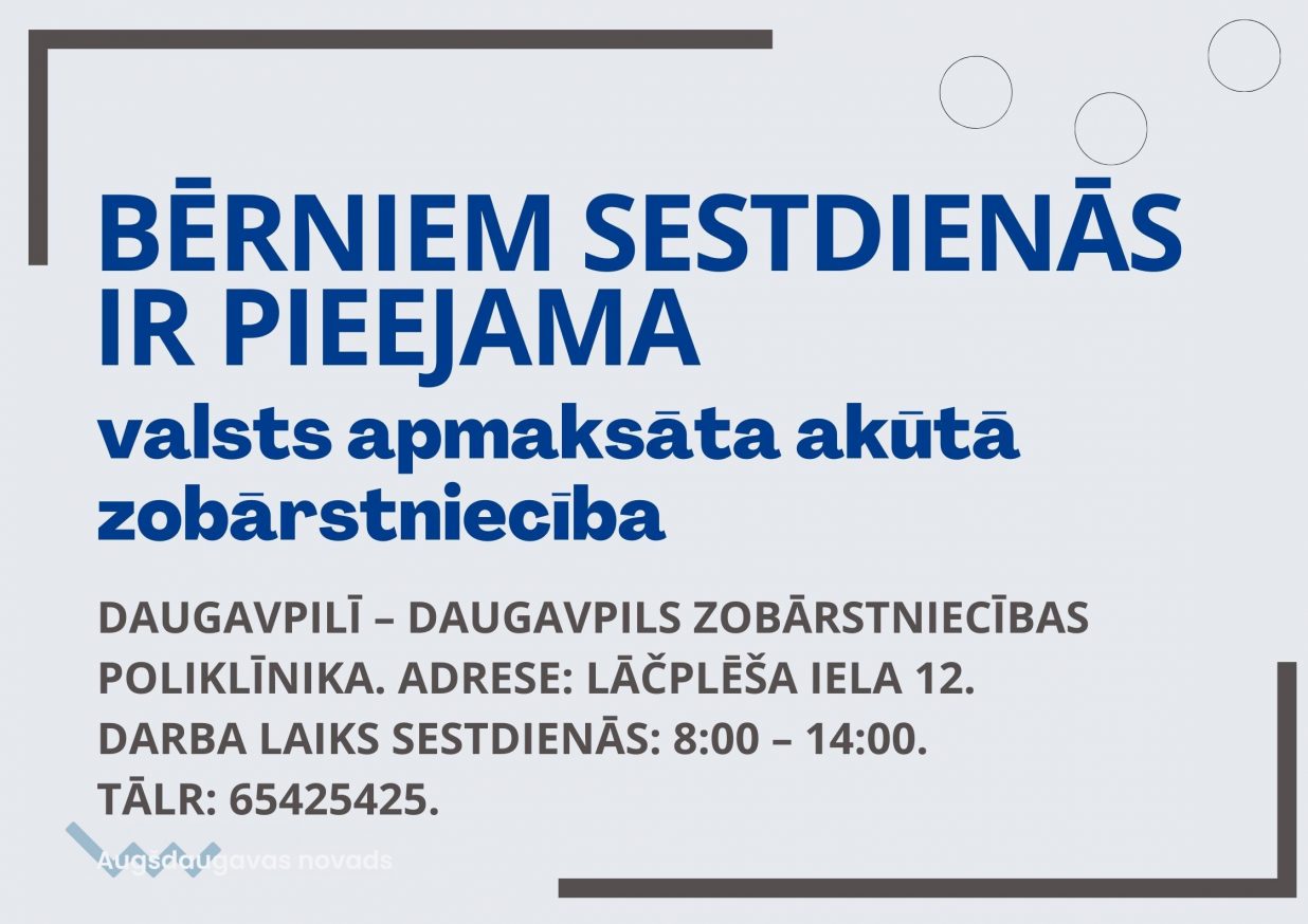 Lai uzlabotu valsts apmaksātas zobārstniecības palīdzības pieejamību, turpmāk bērniem līdz 18 gadu vecumam (neieskaitot) sestdienās ir pieejami valsts apmaksāti zobārstniecības pakalpojumi akūtos gadījumos, kad medicīniskā palīdzība ir nepieciešama pēkšņi vai steidzami. Šādu palīdzību var saņemt Rīgā, Ogrē, Valmierā, Liepājā un Daugavpilī, informē Nacionālais veselības dienests (NVD).