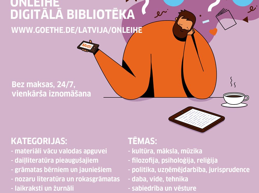 Digitālā bibliotēka Onleihe bez maksas piedāvā vairāk nekā 23 000 medijus vācu valodā - aktuālas Vācijas dienas avīzes un žurnālus, materiālus vācu valodas apguvei, grāmatas pieaugušajiem, bērniem un jauniešiem, nozaru literatūru un rokasgrāmatas, filmas, mūziku un klausāmgrāmatas. Daudzpusīgs piedāvājums katrai gaumei.