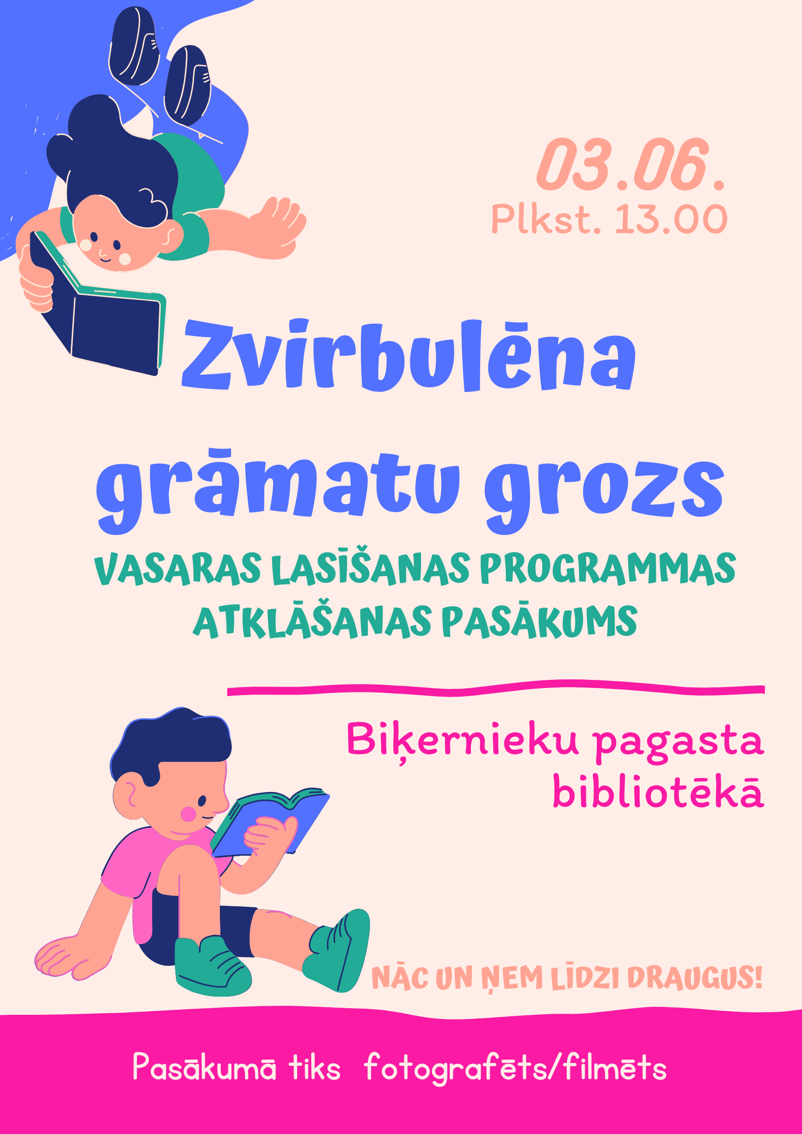 | 03.06. pl.13.00 | Biķernieku bibliotēkā | "Zvirbulēna grāmatu grozs” - Vasaras lasīšanas programmas atklāšanas pasākums |