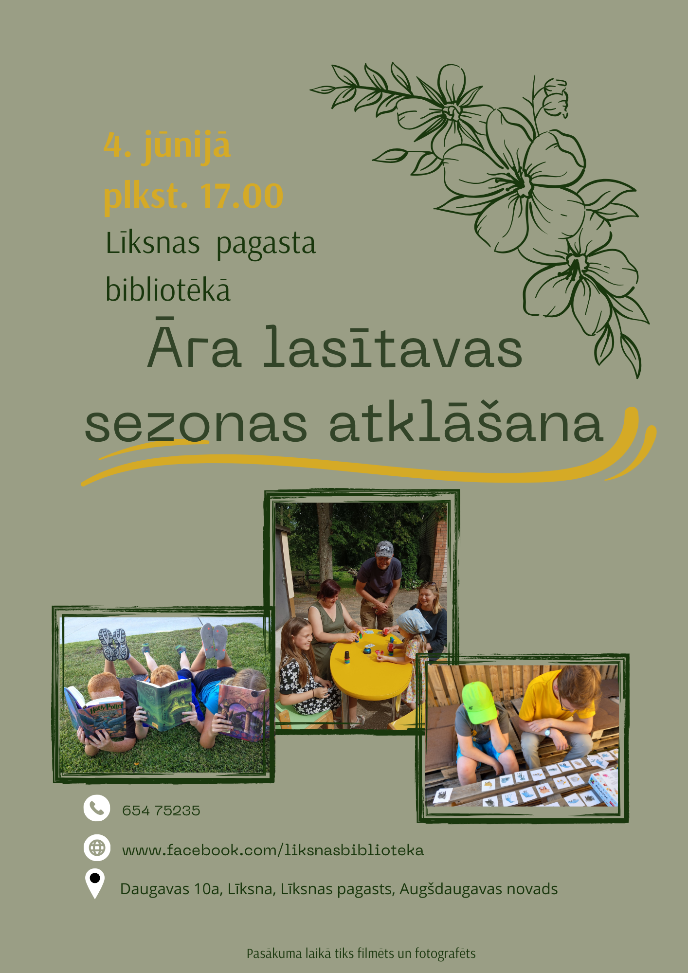 | 04.06. pl.17.00 | Līksnas bibliotēkā | "Āra lasītavas lasāmviela" - sezonas atklāšana |