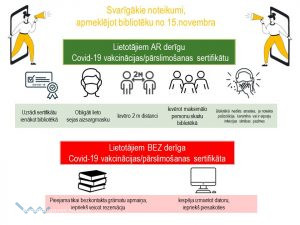 Bibliotēkas atjauno darbību, gan iekštelpās, gan ārtelpās sniedzot pakalpojumus epidemioloģiski drošā režīmā apmeklētājiem, kuri var uzrādīt sadarbspējīgu Covid-19 vakcinācijas vai pārslimošanas sertifikātu.