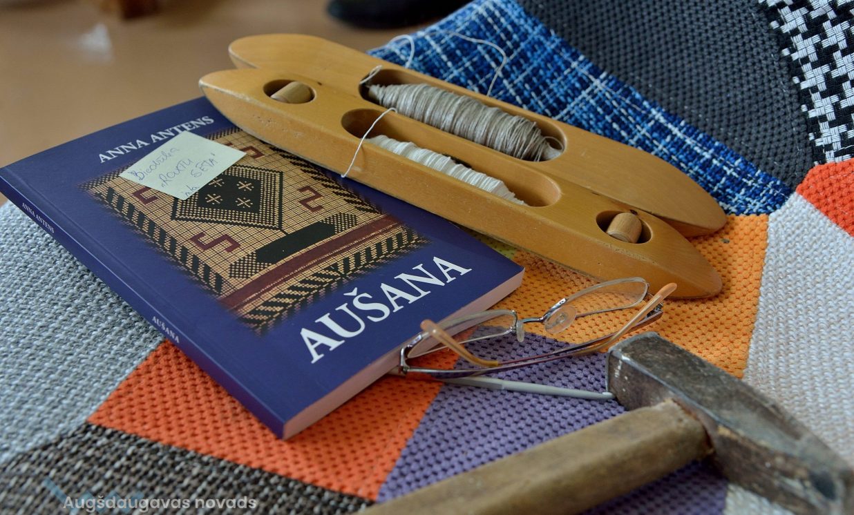 Aušanas meistare Rima Vitaite, kas vada aušanas nodarbības, brauc šurp no Zarasiem un stāsta, ka diegi nodarbībām tika uztīti Lietuvā. “Mēs atbraucam uz Daugavpils novadu jau kādu 9. reizi, mācam un mācāmies arī pašas, jo šeit esošās stelles mums nav tik parocīgas un pazīstamas. Tās ir specifiskas, jo darinātas vēlākos laikos nekā tās, ar kurām strādājam Lietuvā. Pie mums ir tradicionālās stelles. Vispirms bija jāiepērk materiāls – diegi, nītis, virves, lentītes. Pēc tam tika kārtotas stelles. Tas ir ļoti sarežģīts uzdevums. Domājām, ka šodien sāksim aust, bet vienas stelles ir vēl līdz galam jāsakārto, tas pagaidām nav izdevies”.