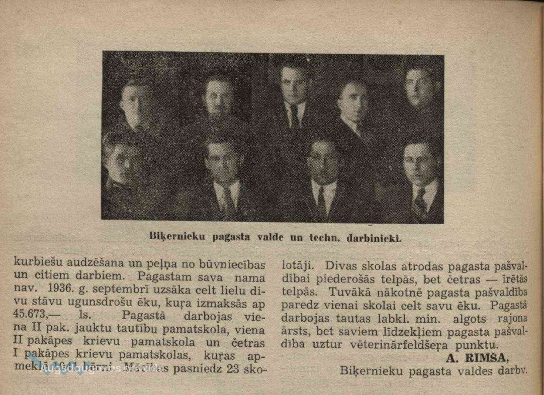 Zemes vērtība tagad ir 1.233.589 ls, aramzemes 1 ha vidējā vērtība 210 ls. Tekošā gada budžets līdzsvarots uz 36.200, ar 5% nodokļu likmju paaugstinājumu. Lielākā daļa pagasta iedzīvotāju ir sīkzemnieki ar lielām ģimenēm (no 5 līdz 15 ģim. loc.) un visus lauksaimniecības ražojumus patērē savām vajadzībām. Lauksaimnieku galvenie ienākumi: cūkkopība, linkopība, cukurbiešu audzēšana un peļņa no būvniecības un citiem darbiem. Pagastam sava nama nav. 1936. g. septembrī uzsāka celt lielu divu stāvu ugunsdrošu ēku, kura izmaksās ap 45.673— ls. Pagastā darbojas viena II pak. jauktu tautību pamatskola, viena II pakāpes krievu pamatskola un četras I pakāpes krievu pamatskolas, kuras apmeklē 1041 bērni. Mācības pasniedz 23 skolotāji. Divas skolas atrodas pagasta pašvaldībai piederošās telpās, bet četras — īrētās telpās. Tuvākā nākotnē pagasta pašvaldība paredz vienai skolai celt savu ēku. Pagastā darbojas tautas labkl. min. algots rajona ārsts, bet saviem līdzekļiem pagasta pašvaldība uztur veterinārfeldšera punktu." (A. RIMŠA, Biķernieku pagasta valdes darbv.)